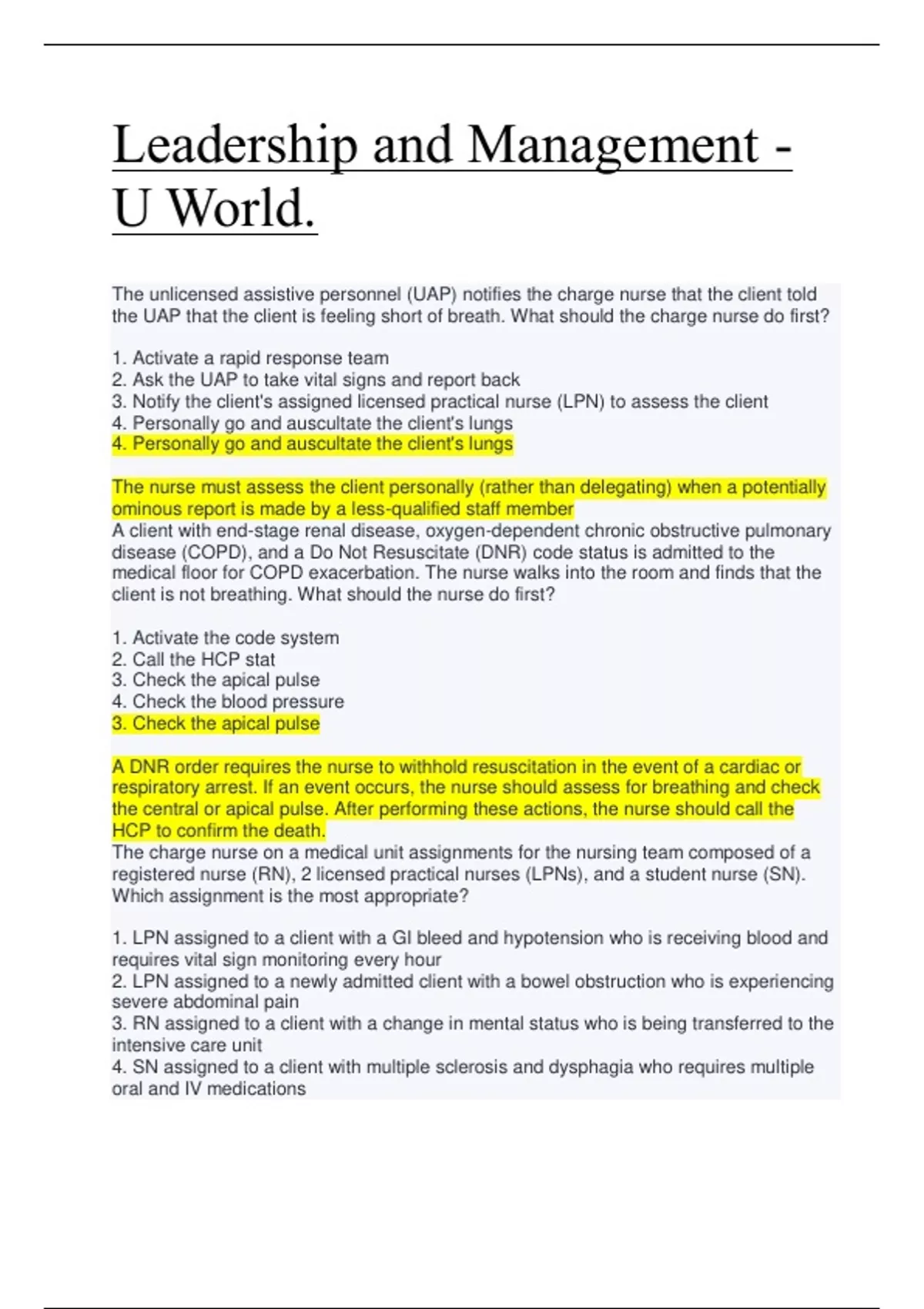 2. Call the HCP stat 3. Check the apical pulse 4. Check the blood pressure 3. Check the apical pulse A DNR order requires the nurse to withhold resuscitation in the event of a cardiac or respiratory arrest. If an event occurs, the nurse should assess for breathing and check the central or apical pulse. After performing these actions, the nurse should call the HCP to confirm the death. The charge nurse on a medical unit assignments for the nursing team composed of a registered nurse (RN), 2 licensed practical nurses (LPNs), and a student nurse (SN). Which assignment is the most appropriate? 1. LPN assigned to a client with a GI bleed and hypotension who is receiving blood and requires vital sign monitoring every hour 2. LPN assigned to a newly admitted client with a bowel obstruction who is experiencing severe abdominal pain 3. RN assigned to a client with a change in mental status who is being transferred to the intensive care unit 4. SN assigned to a client