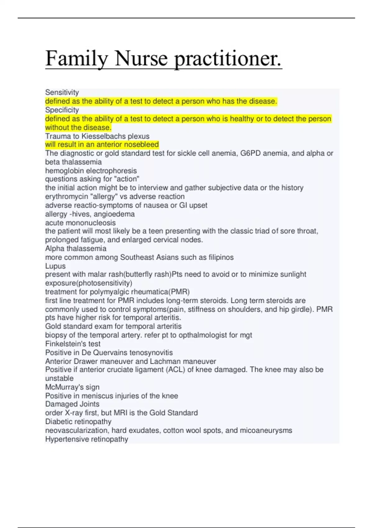 Alpha thalassemia more common among Southeast Asians such as filipinos Lupus present with malar rash(butterfly rash)Pts need to avoid or to minimize sunlight exposure(photosensitivity) treatment for polymyalgic rheumatica(PMR) first line treatment for PMR includes long-term steroids. Long term steroids are commonly used to control symptoms(pain, stiffness on shoulders, and hip girdle). PMR pts have higher risk for temporal arteritis. Gold standard exam for temporal arteritis biopsy of the temporal artery. refer pt to opthalmologist for mgt Finkelstein's test Positive in De Quervains tenosynovitis Anterior Drawer maneuver and Lachman maneuver Positive if anterior cruciate ligament (ACL) of knee damaged. The knee may also be unstable McMurray's sign Positive in meniscus injuries of the knee Damaged Joints order X-ray first, but MRI is the Gold Standard Diabetic retinopathy neovascularization, hard exudates, cotton wool spots, and micoaneurysms Hypertensive retinopathy