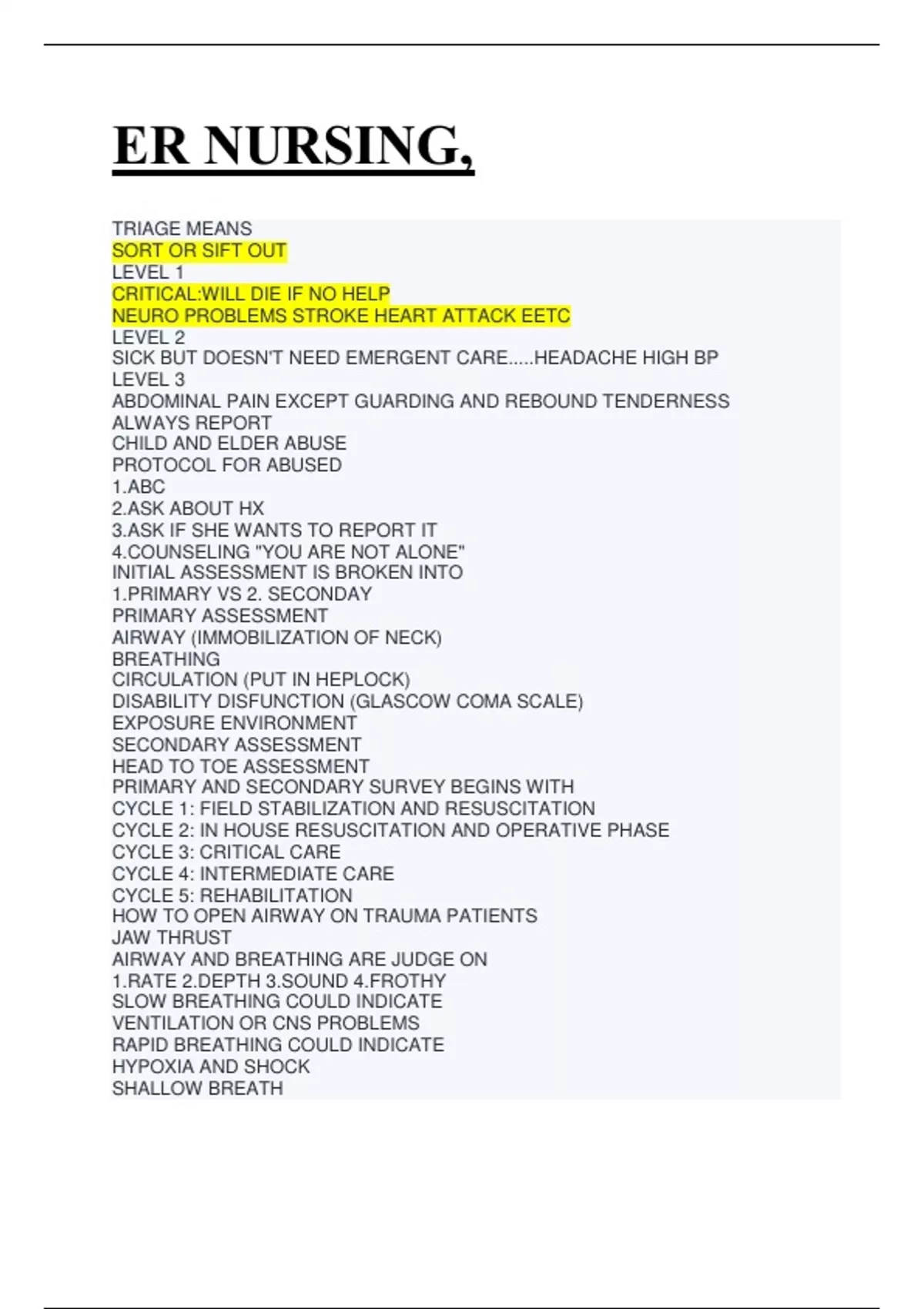 INJURY TO RIBS OR CHEST OR SHOCK DEEP BREATHS HYPOXIA, HYPOGLYCEMIA EXPIRATORY STRIDOR TRACHEAL BRONCHIAL OBSTRUCTION (UPPER AIRWAY OBSTRUCTION) INSPIRATORY STRIDOR LARYNGEAL OBSTRUCTION FROTHY BLOOD TINGED SPUTUM: LUNG INJURY, PULMONARY EDEMA, PULMONARY EMBOLUS! CIRCULATION PUT A HEPLOCK IN EARLY SIGNS OF SHOCK MOOD CHANGE, RESTLESSNESS, DIFFICULTY FOCUSING IMPORTANT WHEN YOU FIND A PATIENT KEEP THEM IN THAT POSITION UNLESS THEY NEED CPR PREVENTATIVE MEASURES DON'T GIVE ORAL FLUIDS IF ABDOMINAL INJURY AND THEY MAY NEED ANESTHESIA CHEST INJURY COULD MEAN HEMOTHORAX OR PNEUMOTHORAX CRUSHING PELVIS INJURY EXPECT BLADDER RUPTURE HEAD INJURIES EXPECT INCREASED ICP SIGNS OF HYPOGLYCEMIA # Confusion # Dizziness # Feeling shaky AND COLD!!!! # Hunger # Headaches # Irritability # Pounding heart; racing pulse!!!!!!!!!!! # Pale skin!!!!!!!!!!!!!!! # Sweating DISASTER TRIAGE 0 black dead DISASTER TRIAGE 1 red: critically life threatening ill...hemorrhage cardiac arrest abdominal injury SPLEEN LACERATION OR LIVER LACERATION DISASTER TRIAGE 2 YELLOW VICTIMS CAN WAIT TRANSPORTATION...THOSE WITH IMMBOLIZED FRACTURES