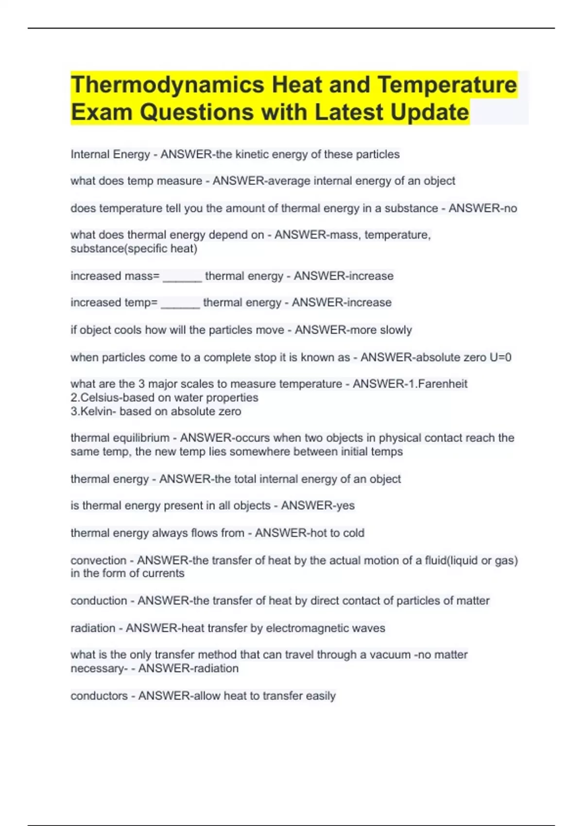 Internal Energy - ANSWER-the kinetic energy of these particles what does temp measure - ANSWER-average internal energy of an object does temperature tell you the amount of thermal energy in a substance - ANSWER-no what does thermal energy depend on - ANSWER-mass, temperature, substance(specific heat) increased mass= ______ thermal energy - ANSWER-increase increased temp= ______ thermal energy - ANSWER-increase if object cools how will the particles move - ANSWER-more slowly when particles come to a complete stop it is known as - ANSWER-absolute zero U=0 what are the 3 major scales to measure temperature - ANSWER-1.Farenheit 2.Celsius-based on water properties 3.Kelvin- based on absolute zero thermal equilibrium - ANSWER-occurs when two objects in physical contact reach the same temp, the new temp lies somewhere between initial temps thermal energy - ANSWER-the total internal energy of an object is thermal energy present in all objects - ANSWER-yes thermal energy always flows from - ANSWER-hot to cold convection - ANSWER-the transfer of heat by the actual motion of a fluid(liquid or gas) in the form of currents conduction - ANSWER-the transfer of heat by direct contact of particles of matter radiation - ANSWER-heat transfer by electromagnetic waves what is the only transfer method that can travel through a vacuum -no matter necessary- - ANSWER-radiation conductors - ANSWER-allow heat to transfer easily