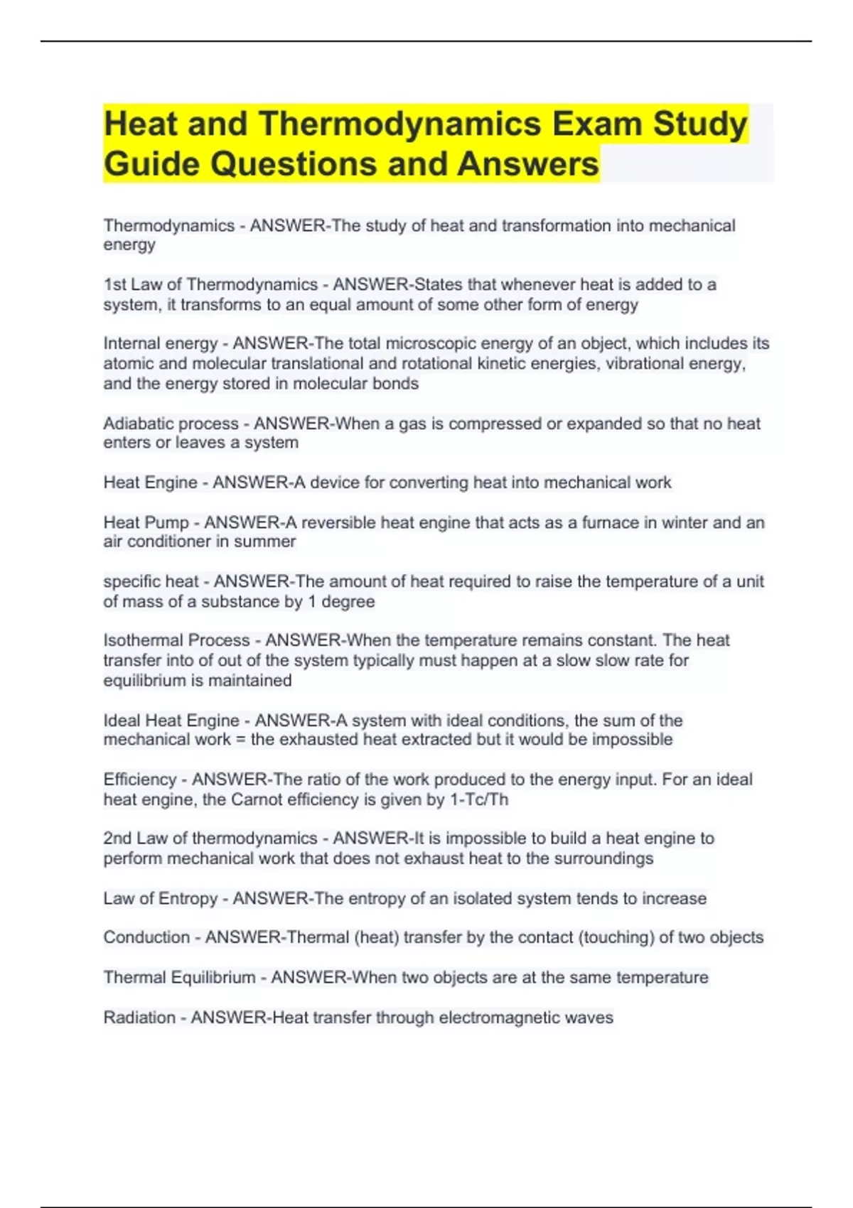 Thermodynamics - ANSWER-The study of heat and transformation into mechanical energy 1st Law of Thermodynamics - ANSWER-States that whenever heat is added to a system, it transforms to an equal amount of some other form of energy Internal energy - ANSWER-The total microscopic energy of an object, which includes its atomic and molecular translational and rotational kinetic energies, vibrational energy, and the energy stored in molecular bonds Adiabatic process - ANSWER-When a gas is compressed or expanded so that no heat enters or leaves a system Heat Engine - ANSWER-A device for converting heat into mechanical work Heat Pump - ANSWER-A reversible heat engine that acts as a furnace in winter and an air conditioner in summer specific heat - ANSWER-The amount of heat required to raise the temperature of a unit of mass of a substance by 1 degree Isothermal Process - ANSWER-When the temperature remains constant. The heat transfer into of out of the system typically must happen at a slow slow rate for equilibrium is maintained Ideal Heat Engine - ANSWER-A system with ideal conditions, the sum of the mechanical work = the exhausted heat extracted but it would be impossible Efficiency - ANSWER-The ratio of the work produced to the energy input. For an ideal heat engine, the Carnot efficiency is given by 1-Tc/Th 2nd Law of thermodynamics - ANSWER-It is impossible to build a heat engine to perform mechanical work that does not exhaust heat to the surroundings Law of Entropy - ANSWER-The entropy of an isolated system tends to increase Conduction - ANSWER-Thermal (heat) transfer by the contact (touching) of two objects Thermal Equilibrium - ANSWER-When two objects are at the same temperature Radiation - ANSWER-Heat transfer through electromagnetic waves