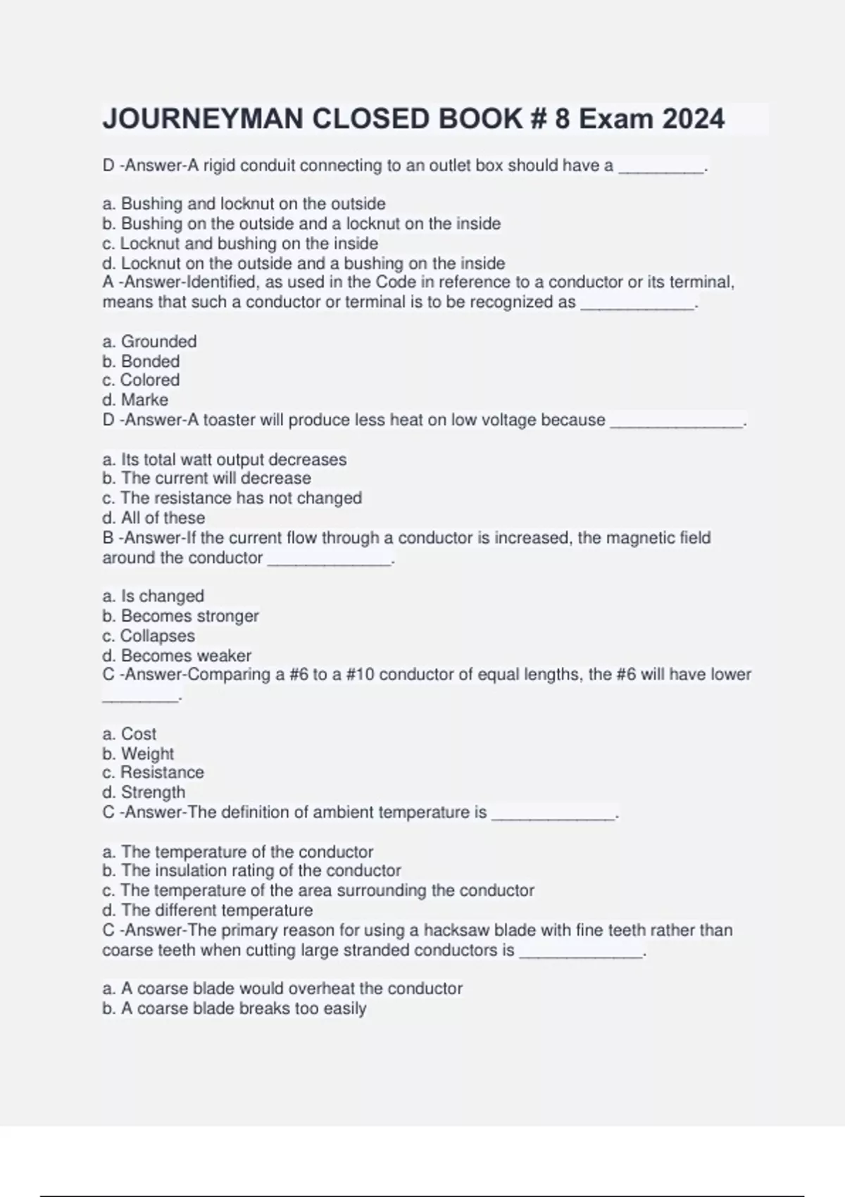 JOURNEYMAN CLOSED BOOK # 8 Exam 2024 D -Answer-A rigid conduit connecting to an outlet box should have a _________. a. Bushing and locknut on the outside b. Bushing on the outside and a locknut on the inside c. Locknut and bushing on the inside d. Locknut on the outside and a bushing on the inside A -Answer-Identified, as used in the Code in reference to a conductor or its terminal, means that such a conductor or terminal is to be recognized as ____________. a. Grounded b. Bonded c. Colored d. Marke D -Answer-A toaster will produce less heat on low voltage because ______________. a. Its total watt output decreases b. The current will decrease c. The resistance has not changed d. All of these B -Answer-If the current flow through a conductor is increased, the magnetic field around the conductor _____________. a. Is changed b. Becomes stronger c. Collapses d. Becomes weaker C -Answer-Comparing a #6 to a #10 conductor of equal lengths, the #6 will have lower ________. a. Cost b. Weight c. Resistance d. Strength C -Answer-The definition of ambient temperature is _____________. a. The temperature of the conductor b. The insulation rating of the conductor c. The temperature of the area surrounding the conductor d. The different temperature C -Answer-The primary reason for using a hacksaw blade with fine teeth rather than coarse teeth when cutting large stranded conductors is _____________. a. A coarse blade would overheat the conductor b. A coarse blade breaks too easily c. To avoid snagging or pulling strands d. A fine blade will bend easier B -Answer-The stranded residential service is a 3-wire, 240 volt single-phase system. The maximum voltage to ground in this system would be __________ volts. a. 115 b. 120 c. 199 d. 208 A -Answer-When working on a motor, the electrician should ____ to prevent accidental starting of the motor. a. Remove the fuses b. Ground the motor c. Shut off the switch d. Remove the belts A -Answer-It is the responsibility of the electrician to make sure his tools are in good condition because ___. a. Defective tool can cause accidents b. The boss may want to use them c. The company will pay for only one set of tools d. A good job requires perfect tools B -Answer-Continually overloading a conductor is a poor practice because it causes ___________. a. The conductor to melt b. The insulation to deteriorate c. The conductor to shrink d. Damage the raceway B -Answer-For better illumination you would __________. a. Random spacing of lights b. Even spacing, numerous lights c. Evenly spaced, higher ceilings d. Cluster lights B -Answer-A junction box above a lay-in ceiling is considered _________. a. Concealed b. Accessible c. Readily accessible d. Recessed C -Answer-Which of the following metals is most commonly used in the filament of a bulb? a. Aluminum b. Mercury c. Tungsten d. Platinum D -Answer-Electrical equipment can be defined as ______________. I. Fittings II. Appliances III. Devices IV. Fixtures a. I only b. I & IV only c. I,III & IV only d. All of these C -Answer-If two equal resistance conductors are connected in parallel, the resistance of the two conductors is equal to __________