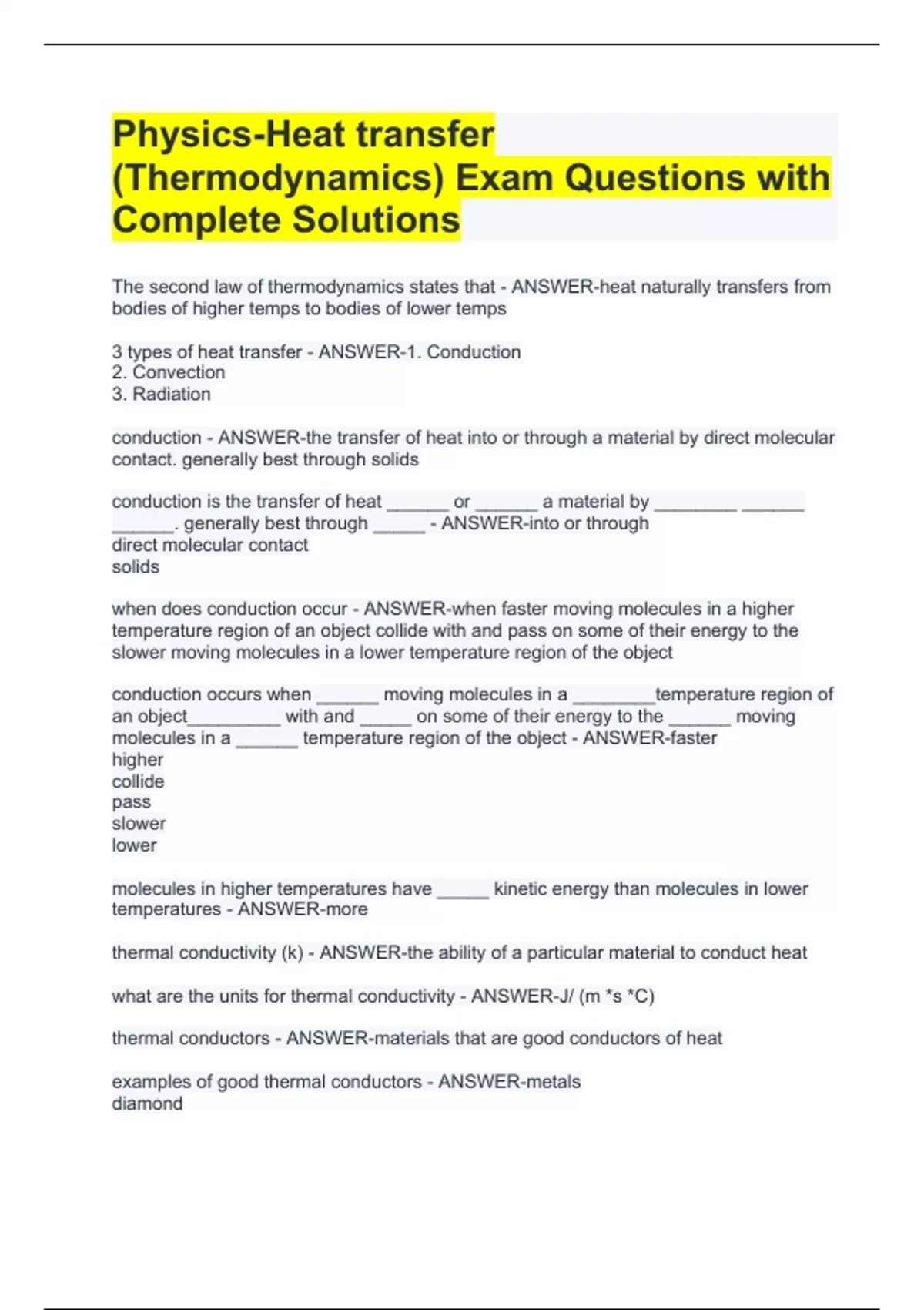 The second law of thermodynamics states that - ANSWER-heat naturally transfers from bodies of higher temps to bodies of lower temps 3 types of heat transfer - ANSWER-1. Conduction 2. Convection 3. Radiation conduction - ANSWER-the transfer of heat into or through a material by direct molecular contact. generally best through solids conduction is the transfer of heat ______ or ______ a material by ________ ______ ______. generally best through _____ - ANSWER-into or through direct molecular contact solids when does conduction occur - ANSWER-when faster moving molecules in a higher temperature region of an object collide with and pass on some of their energy to the slower moving molecules in a lower temperature region of the object conduction occurs when ______ moving molecules in a ________temperature region of an object_________ with and _____ on some of their energy to the ______ moving molecules in a ______ temperature region of the object - ANSWER-faster higher collide pass slower lower molecules in higher temperatures have _____ kinetic energy than molecules in lower temperatures - ANSWER-more thermal conductivity (k) - ANSWER-the ability of a particular material to conduct heat what are the units for thermal conductivity - ANSWER-J/ (m *s *C) thermal conductors - ANSWER-materials that are good conductors of heat examples of good thermal conductors - ANSWER-metals diamond