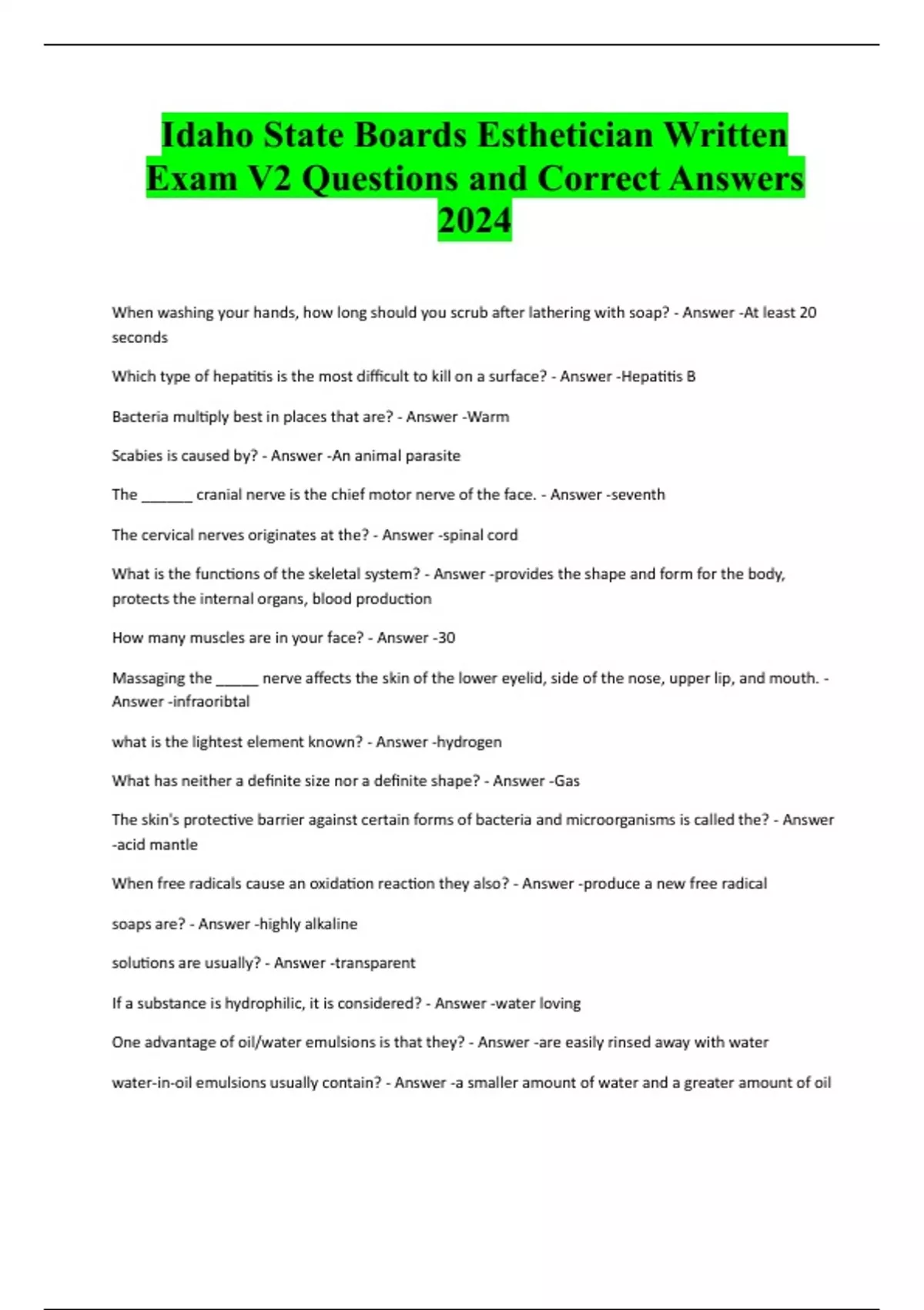 Idaho State Boards Esthetician Written Exam V2 Questions and Correct Answers 2024 When washing your hands, how long should you scrub after lathering with soap? - Answer -At least 20 seconds Which type of hepatitis is the most difficult to kill on a surface? - Answer -Hepatitis B Bacteria multiply best in places that are? - Answer -Warm Scabies is caused by? - Answer -An animal parasite The ______ cranial nerve is the chief motor nerve of the face. - Answer -seventh The cervical nerves originates at the? - Answer -spinal cord What is the functions of the skeletal system? - Answer -provides the shape and form for the body, protects the internal organs, blood production How many muscles are in your face? - Answer -30 Massaging the _____ nerve affects the skin of the lower eyelid, side of the nose, upper lip, and mouth. - Answer -infraoribtal what is the lightest element known? - Answer -hydrogen What has neither a definite size nor a definite shape? - Answer -Gas The skin's protective barrier against certain forms of bacteria and microorganisms is called the? - Answer -acid mantle When free radicals cause an oxidation reaction they also? - Answer -produce a new free radical soaps are? - Answer -highly alkaline solutions are usually? - Answer -transparent If a substance is hydrophilic, it is considered? - Answer -water loving One advantage of oil/water emulsions is that they? - Answer -are easily rinsed away with water water-in-oil emulsions usually contain? - Answer -a smaller amount of water and a greater amount of oilThe early Hebrews used myrrh in powder form to? - Answer -repel fleas Which culture determined a person's beauty by how or she looked when naked? - Answer -The Greeks Your career options as an esthetician include? - Answer -day spa esthetician, salon manager and makeup artist The grooming rituals of the early Hebrew were based on the principle that? - Answer -their bodies were gifts to be cared for What does a state licensing inspector do? - Answer -inspect sa