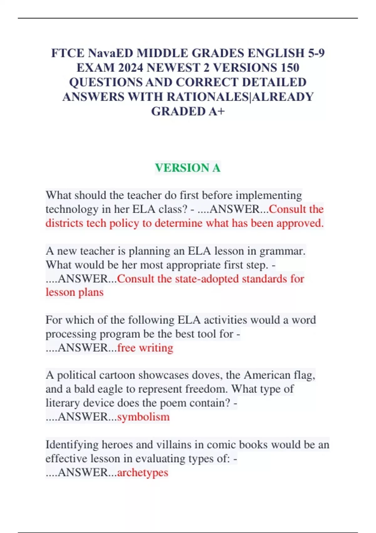 FTCE NavaED MIDDLE GRADES ENGLISH 5-9 EXAM 2024 NEWEST 2 VERSIONS 150 QUESTIONS AND CORRECT DETAILED ANSWERS WITH RATIONALES|ALREADY GRADED A+