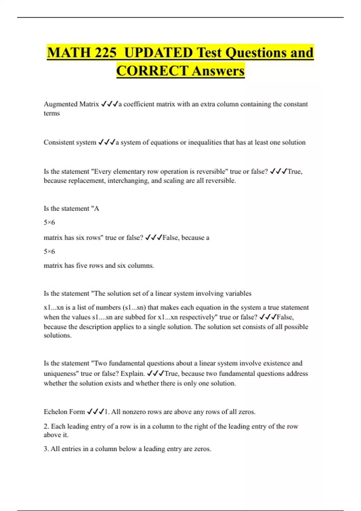 Augmented Matrix a coefficient matrix with an extra column containing the constant terms Consistent system a system of equations or inequalities that has at least one solution Is the statement "Every elementary row operation is reversible" true or false? True, because replacement, interchanging, and scaling are all reversible. Is the statement "A 5×6 matrix has six rows" true or false? False, because a 5×6 matrix has five rows and six columns.