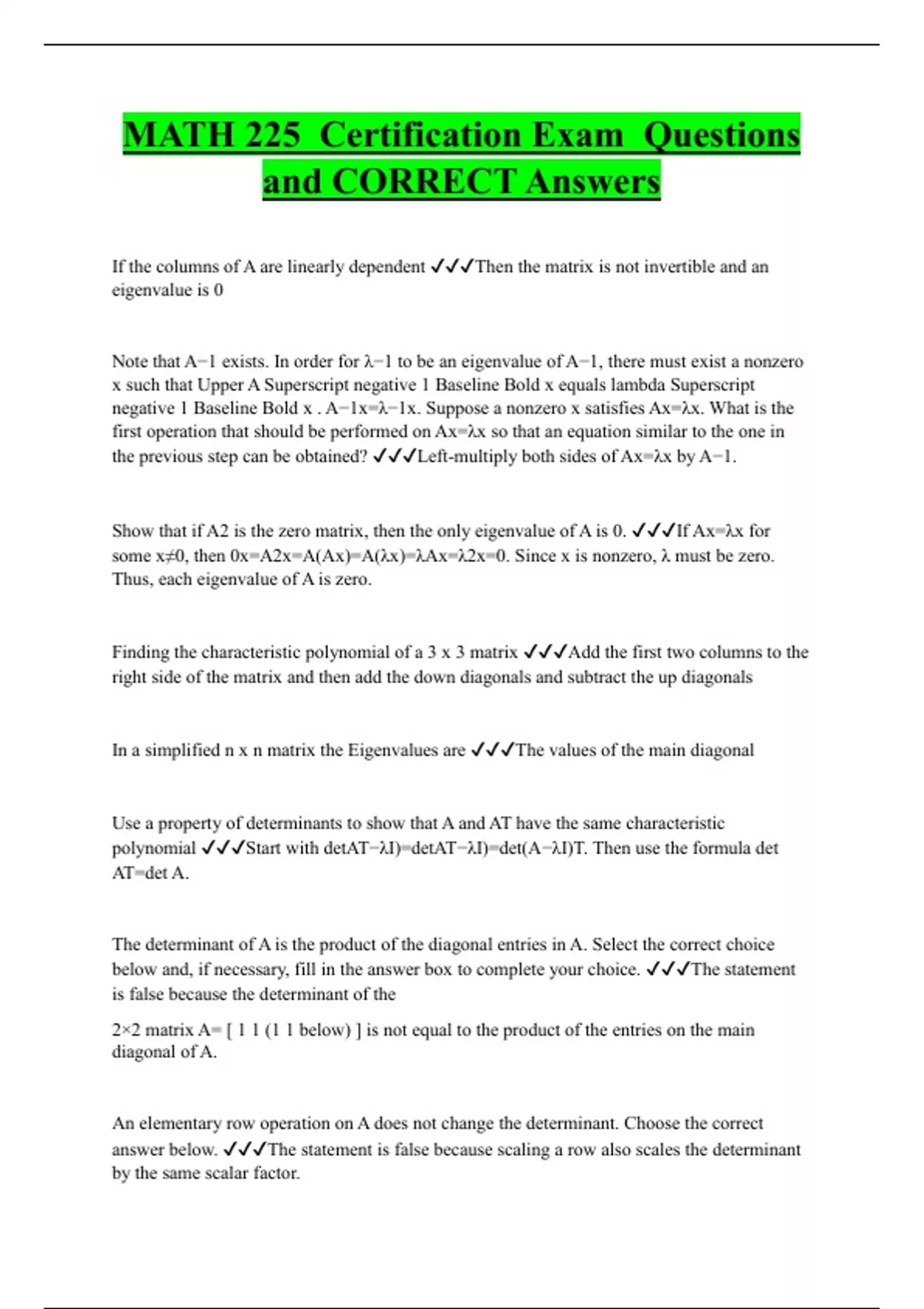 MATH 225 Certification Exam Questions and CORRECT Answers