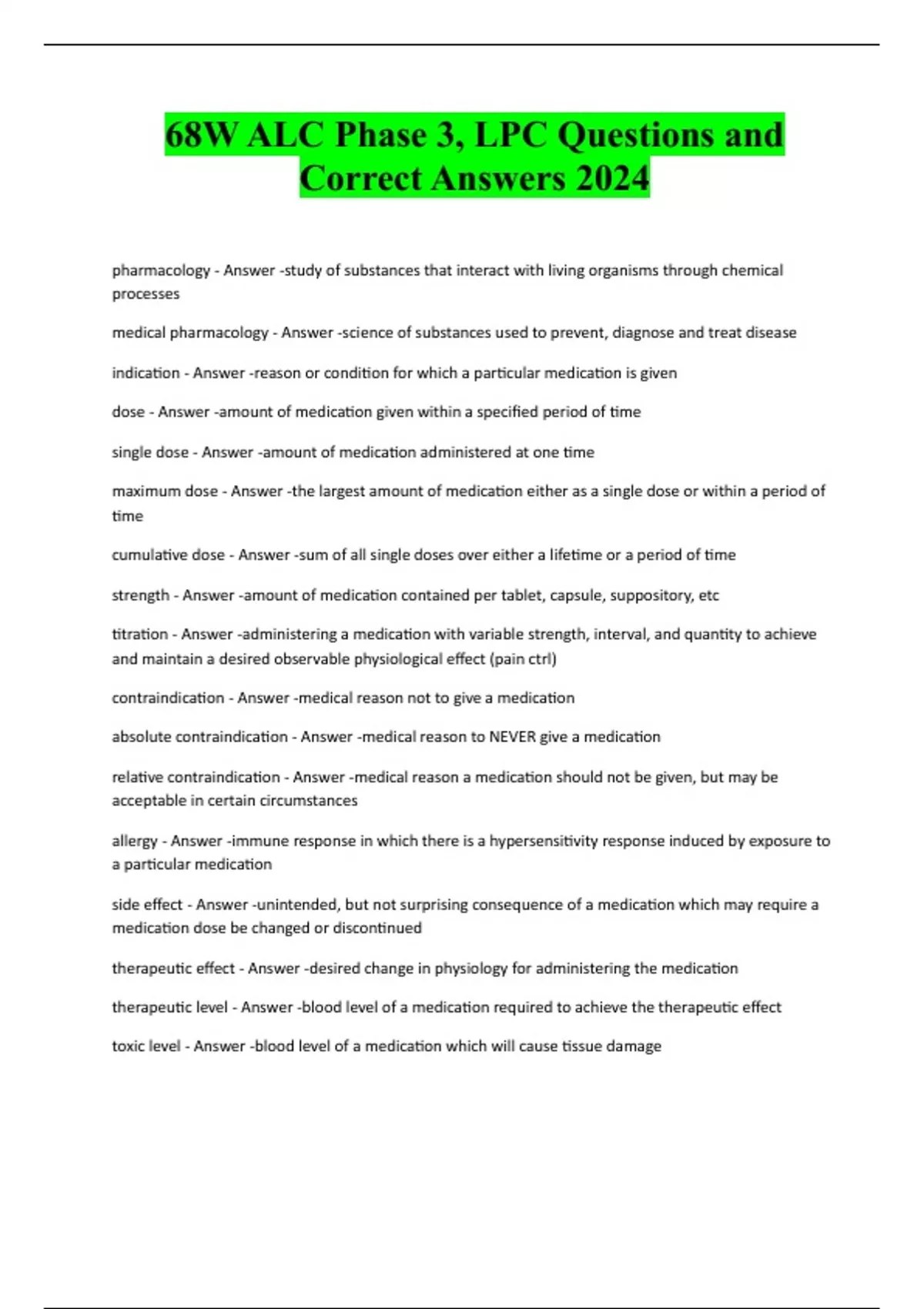 maximum dose - Answer -the largest amount of medication either as a single dose or within a period of