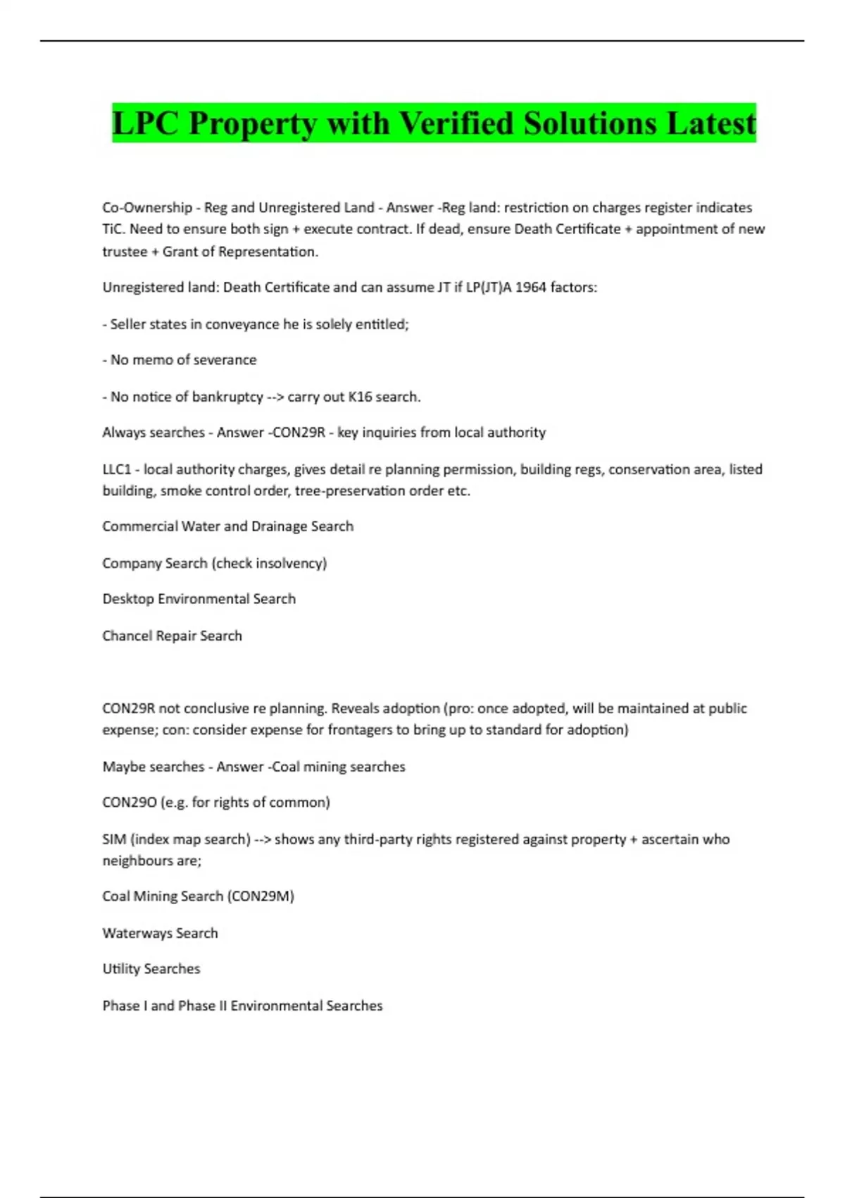 LPC Property with Verified Solutions Latest Co-Ownership - Reg and Unregistered Land - Answer -Reg land: restriction on charges register indicates TiC. Need to ensure both sign + execute contract. If dead, ensure Death Certificate + appointment of new trustee + Grant of Representation. Unregistered land: Death Certificate and can assume JT if LP(JT)A 1964 factors: - Seller states in conveyance he is solely entitled; - No memo of severance - No notice of bankruptcy --> carry out K16 search. Always searches - Answer -CON29R - key inquiries from local authority LLC1 - local authority charges, gives detail re planning permission, building regs, conservation area, listed building, smoke control order, tree-preservation order etc. Commercial Water and Drainage Search Company Search (check insolvency) Desktop Environmental Search Chancel Repair Search CON29R not conclusive re planning. Reveals adoption (pro: once adopted, will be maintained at public expense; con: consider expense for frontagers to bring up to standard for adoption) Maybe searches - Answer -Coal mining searches CON29O (e.g. for rights of common) SIM (index map search) --> shows any third-party rights registered against property + ascertain who neighbours are; Coal Mining Search (CON29M) Waterways Search Utility Searches Phase I and Phase II Environmental SearchesHighways Authority Search --> ransom strip Enforcement periods - Answer -4 years - change of use to dwelling house, works 10 years - breach of PP condition, change of using other than dwelling house forever - building regs (get that building regularisation certificate), LB consent, CA consent Effects of listed building - Answer -Permitted d