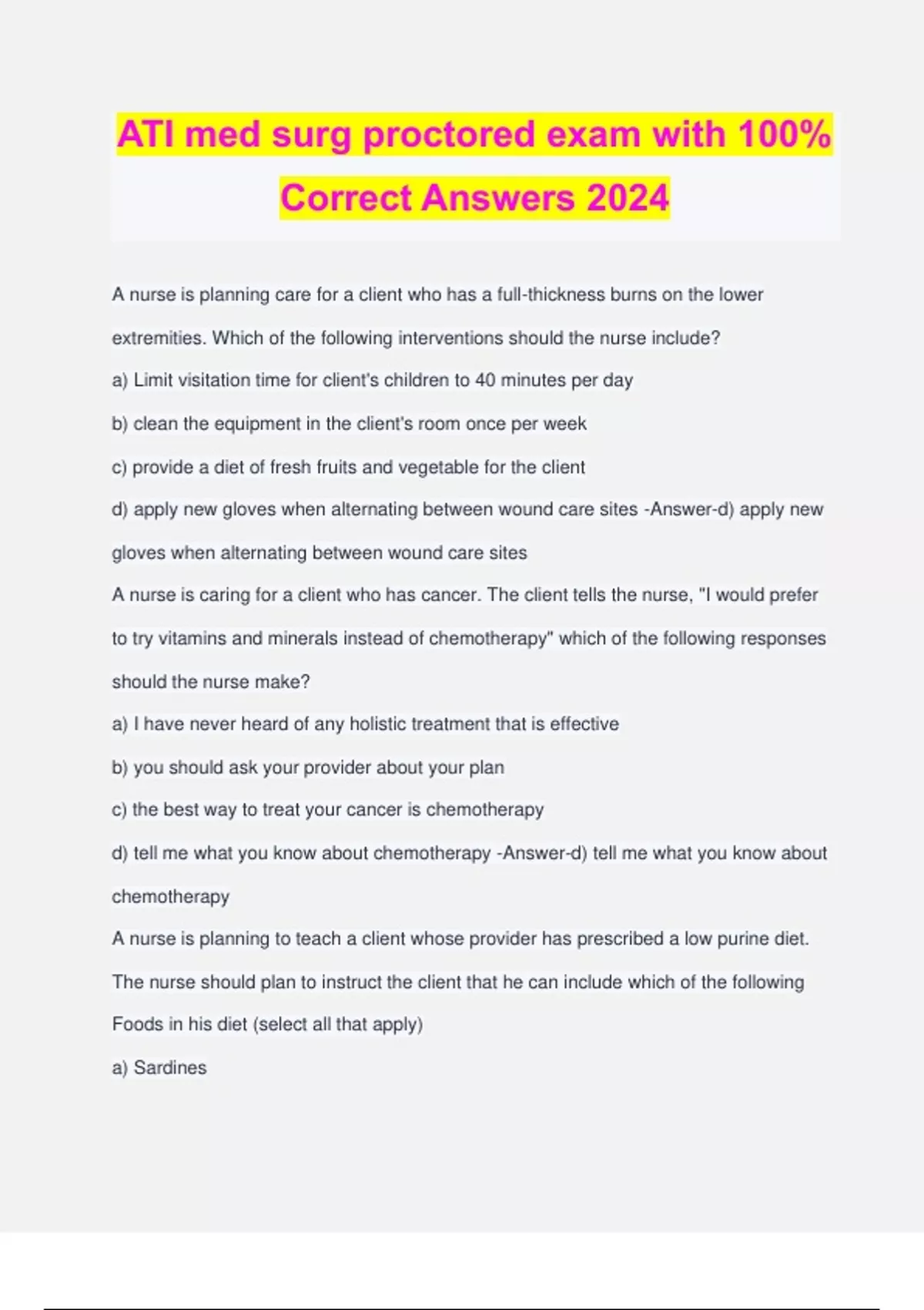 ATI med surg proctored exam with 100% Correct Answers 2024 A nurse is planning care for a client who has a full-thickness burns on the lower extremities. Which of the following interventions should the nurse include? a) Limit visitation time for client's children to 40 minutes per day b) clean the equipment in the client's room once per week c) provide a diet of fresh fruits and vegetable for the client d) apply new gloves when alternating between wound care sites -Answer-d) apply new gloves when alternating between wound care sites A nurse is caring for a client who has cancer. The client tells the nurse, "I would prefer to try vitamins and minerals instead of chemotherapy" which of the following responses should the nurse make? a) I have never heard of any holistic treatment that is effective b) you should ask your provider about your plan c) the best way to treat your cancer is chemotherapy d) tell me what you know about chemotherapy -Answer-d) tell me what you know about chemotherapy A nurse is planning to teach a client whose provider has prescribed a low purine diet. The nurse should plan to instruct the client that he can include which of the following Foods in his diet (select all that apply) a) Sardines b) Nuts c) Apricots d) liver e) scallops -Answer-b) Nuts c) Apricots Nurse is caring for a client following a total knee arthroplasty. The client reports a pain level of 6 on a paint scale of 0 to 10. Which of the following interventions should the nurse take? a) Place pillowsl under the clients knee b) gently massage the area around the clients incision c) apply an ice pack to the clients knee d) perform range of motion exercises to the clients knee -Answer-c) apply an ice pack to the clients knee A nurse is caring for a client who has lower extremity fracture and a prescription for crutches. Which of the following client statements indicates that the client is adapting to their role change? a) I will need to have my partner take over shopping for groceries and cooking the meals for us b) Its going to be difficult to tell my parents I can't take them to their appointments anymore c) I feel bad that I have to ask my partner to keep the house clean d) These crutches will make it impossible to care for my child -Answer-a) I will need to have my partner take over shopping for groceries and cooking the meals for us A nurse is assessing a client who is preoperative and reports an allergy to bananas. The nurse should recognize that the client is at risk for an allergic cross-reactivity to which of the following substances? a) adhesive tape b) Latex c) Anesthetics d) povidone iodine -Answer-b) Latex A nurse on a medical unit is planning care for a group of clients. Which of the following clients should the nurse attend to First? a) A client who has chronic obstructive pulmonary disease in oxygen saturation of 89% b) a client who has left-sided paralysis and slurred speech from a prior stroke c) a client who has thrombocytopenia and reports a nosebleed d) a client who has multiple sclerosis and reports Ataxia and vertigo -Answer-c) a client who has thrombocytopenia and reports a nosebleed A nurse is monitoring a client who is receiving two units packed RBC's. Which of the following manifestation indicates a hemolytic transfusion reaction? a) back pain b) Hypertension c) Chills d) bradycardia -Answer-a) back pain A nurse is teaching a client who has diabetes mellitus about foot care. Which of the following instruction should the nurse include? a) Use a heating pad to keep your feet warm at night b) wear loose-fitting slippers around the house c) where cotton rather than nylon socks d) wash your face twice per day with antibacterial soap and hot water -Answer-c) where cotton rather than nylon socks A nurse is providing teaching to a client who has a deep vein thrombosis (DVT) . Which of the following findings should the nurse identify as a risk factor for the development of the DVTs? a) NSAID use b) hypertension c) oral contraceptive use d) cirrhosis -Answer-c) oral contraceptive use A nurse is caring for a client who has a sealed radiation implant. Which of the following actions should the nurse take? a) Remove soiled linens from the room after each change b) Give the dosimeter badge to the oncoming nurse at the end of the shift c) Apply a second pair of gloves before touching the client's implant if it dislodges d) Limit family member visits to 30 min per day -Answer-d) Limit family member visits to 30 min per day A nurse is providing teaching to a client and his partner about performing peritoneal dialysis at home. When discussing peritonitis, which of the following manifestations should the nurse identify as the earliest indication of this complication? a) Generalized abdominal pain b) Cloudy effluent c) Increased heart rate d) Fever -Answer-d) Fever A nurse is caring for a client who is receiving a blood transfusion. The nurse observes that the client has bounding peripheral pulses, hypertension, and distended jugular veins. The nurse should anticipate administering which of the following prescribed medications? a) Pantoprazole b) Acetaminophen c) Furosemide d) Diphenhydramine -Answer-c) Furosemide A nurse is planning care for a client who has upper gastrointestinal bleeding due to a peptic ulcer. Which of the following actions should the nurse plan to take? a) Provide ketorolac for abdominal pain b) Administer nitroprusside IV based on the client's weight c) Insert a large bore nasogastric tube d) Ensure that the client has a 22- gauge iv line in place -Answer-c) Insert a large bore nasogastric tube A nurse is caring for a client who has bladder cancer and a WBC count of 900/mm3. Which of the following actions should the nurse take? a) Instruct client to avoid eating raw fruit b) Move the client to a negative pressure room c) Use contact isolation while providing care d) Apply pressure to venipuncture sites for 10 min -Answer-a) Instruct client to avoid eating raw fruit A nurse is ca