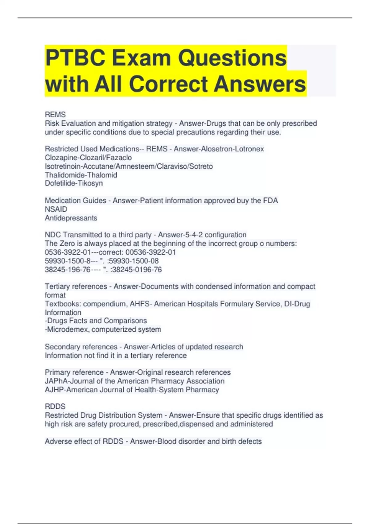 PTBC Exam Questions with All Correct Answers REMS Risk Evaluation and mitigation strategy - Answer-Drugs that can be only prescribed under specific conditions due to special precautions regarding their use. Restricted Used Medications-- REMS - Answer-Alosetron-Lotronex Clozapine-Clozaril/Fazaclo Isotretinoin-Accutane/Amnesteem/Claraviso/Sotreto Thalidomide-Thalomid Dofetilide-Tikosyn Medication Guides - Answer-Patient information approved buy the FDA NSAID Antidepressants NDC Transmitted to a third party - Answer-5-4-2 configuration The Zero is always placed at the beginning of the incorrect group o numbers: ---correct: 0 --- ". : ". : Tertiary references - Answer-Documents with condensed information and compact format Textbooks: compendium, AHFS- American Hospitals Formulary Service, DI-Drug Information -Drugs Facts and Comparisons -Microdemex, computerized system Secondary references - Answer-Articles of updated research Information not find it in a tertiary reference Primary reference - Answer-Original research references JAPhA-Journal of the American Pharmacy Association AJHP-American Journal of Health-System Pharmacy RDDS Restricted Drug Distribution System - Answer-Ensure that specific drugs identified as high risk are safety procured, prescribed,dispensed and administered Adverse effect of RDDS - Answer-Blood disorder and birth defects SBP- State Boards Pharmacy - Answer-Register or licensing pharmacy technicians AMP- average manufacturer price - Answer-Average price paid to manufacturers by wholesalers for drugs distributed through retail pharmacies. PBM- Pharmacy Benefit Managers - Answer-Organizations that administer pharmacy benefits for private or third party payers ICD-9 - Answer-Diagnosis MS that measure weight - Answer-Gram MS that measure length - Answer-Meter MS that measure volume - Answer-Liter ASP Average Sales Price - Answer-- manufacturer reported selling price data 1 gr-grain - Answer-60 mg or 65 mg 81 mg ---to gr - Answer-1.25 grain or 1 1/4 1 gallon - Answer-3785 mL 1 lb - Answer-454 grams Ratio 1:10,000 as a % - Answer-1/10000= 0.0001 0.0001 x 100 = 0.01 = 0.01% Percentage 0.05% to ratio - Answer-0.05/100 = 1/x = 1/2000= 1:2000 0.05% to fraction - Answer-5/100 {/ 5}= 1/20