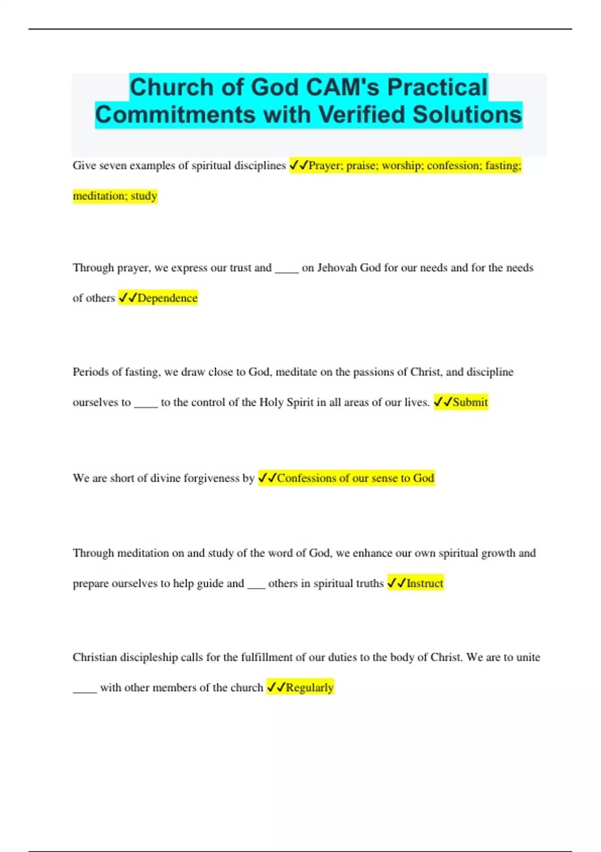 Church of God CAM's Practical Commitments with Verified Solutions Give seven examples of spiritual disciplines Prayer; praise; worship; confession; fasting; meditation; study Through prayer, we express our trust and ____ on Jehovah God for our needs and for the needs of others Dependence Periods of fasting, we draw close to God, meditate on the passions of Christ, and discipline ourselves to ____ to the control of the Holy Spirit in all areas of our lives. Submit We are short of divine forgiveness by Confessions of our sense to God Through meditation on and study of the word of God, we enhance our own spiritual growth and prepare ourselves to help guide and ___ others in spiritual truths Instruct Christian discipleship calls for the fulfillment of our duties to the body of Christ. We are to unite ____ with other members of the church Regularly Sunday is the Christian day for worship and commemorate the___of Christ Resurrection We are to provide for the financial needs of the church by giving of___ and offerings Tithes It is our duty to respect and to___to those whom the Lord Jesus has placed over us in the church Submit Christians must not belong to any society or body that requires or practices an___that supersedes or excludes their fellowship in Christ Allegiance And the Scriptures, the virtues of thrifty and simplicity are honored, but the vices of____and ostentation are solemnly prohibited Waste The living of a godly and sober life requires the wise and frugal use of our temporal blessing, including: Time; talent; and money As good stewards we are to make the most of our time, whether for___or for work Recreation The auto use of leisure time to grades, but the edifying use of it brings inner: Renewal All work and play should ___ name of God Honor The body is the___of the Holy Ghost, and we are to glorify God in our bodies Temple 1 Corinthians 6:9 list various ___ which do not glorify God and which characterize unrighteousness Fleshly behaviors Worldly___such as hatred, envy, and jealousy are condemned in scripture Attitudes Corrupt___such as gossip, angry outburst, and filthy words are condemned in the Scriptures Communication The literature we read, the programs we watch, and the music we listen to profoundly affect the way we ___, think, and behave Feel It is imperative that the Christians read, watch, and listen to those things which inspire, instruct, and___to a higher plane of living Challenge A Christian is not to attend (or watch on television) movies or theatrical performances which are: Demoralizing The use of leisure time in the life of a Christian should be characterized by those activities which edify both the___and the___of Christ Individual; body A Christian must not be a part of any type of entertainment