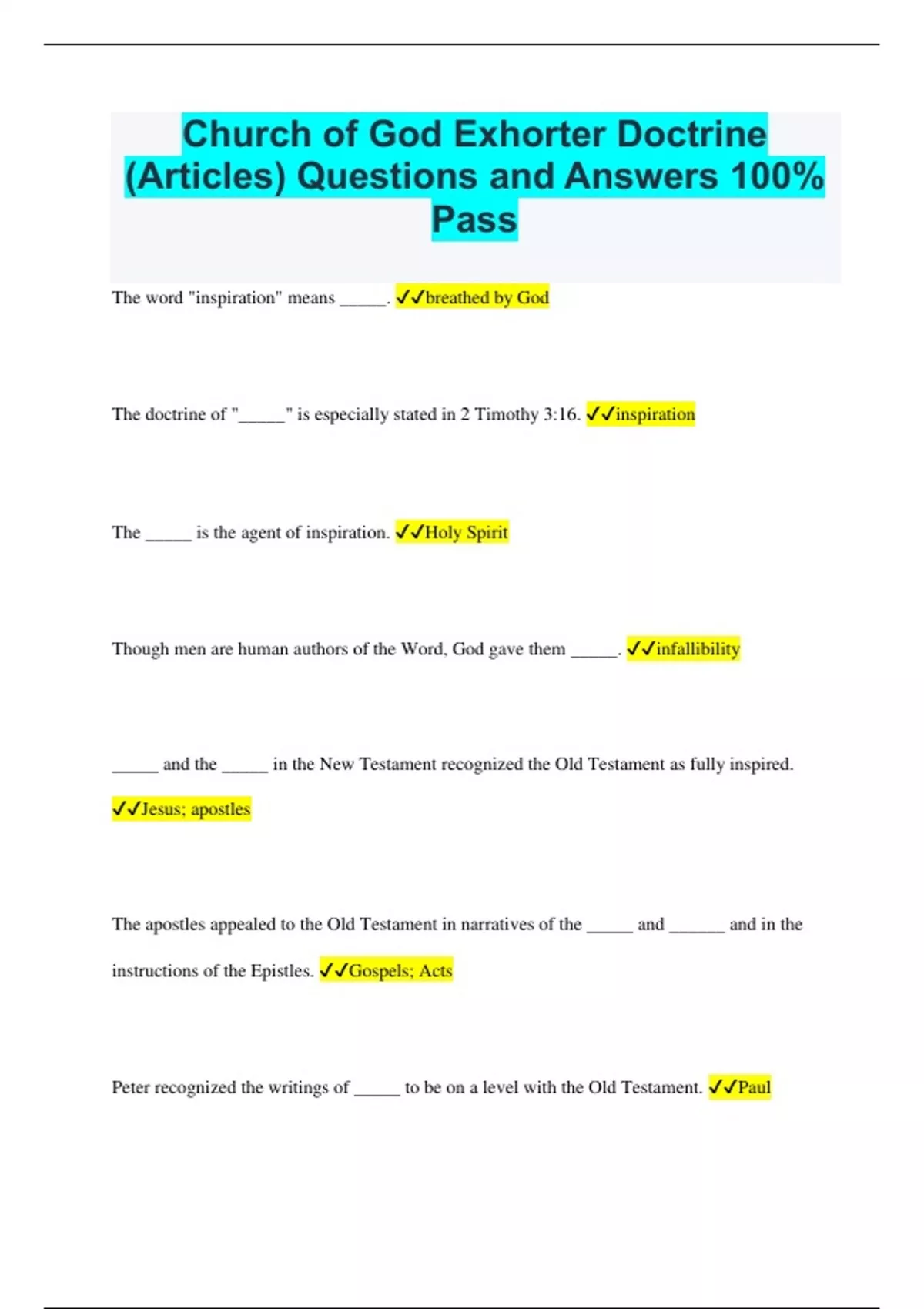 Church of God Exhorter Doctrine (Articles) Questions and Answers 100% Pass