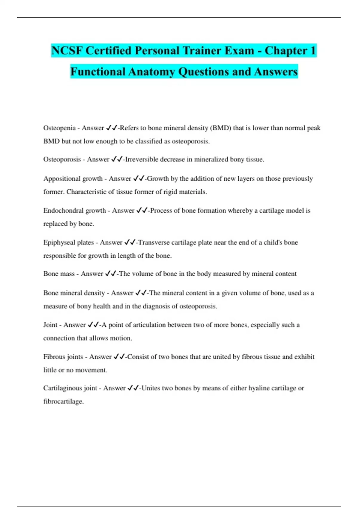 NCSF Certified Personal Trainer Exam - Chapter 1 Functional Anatomy Questions and Answers