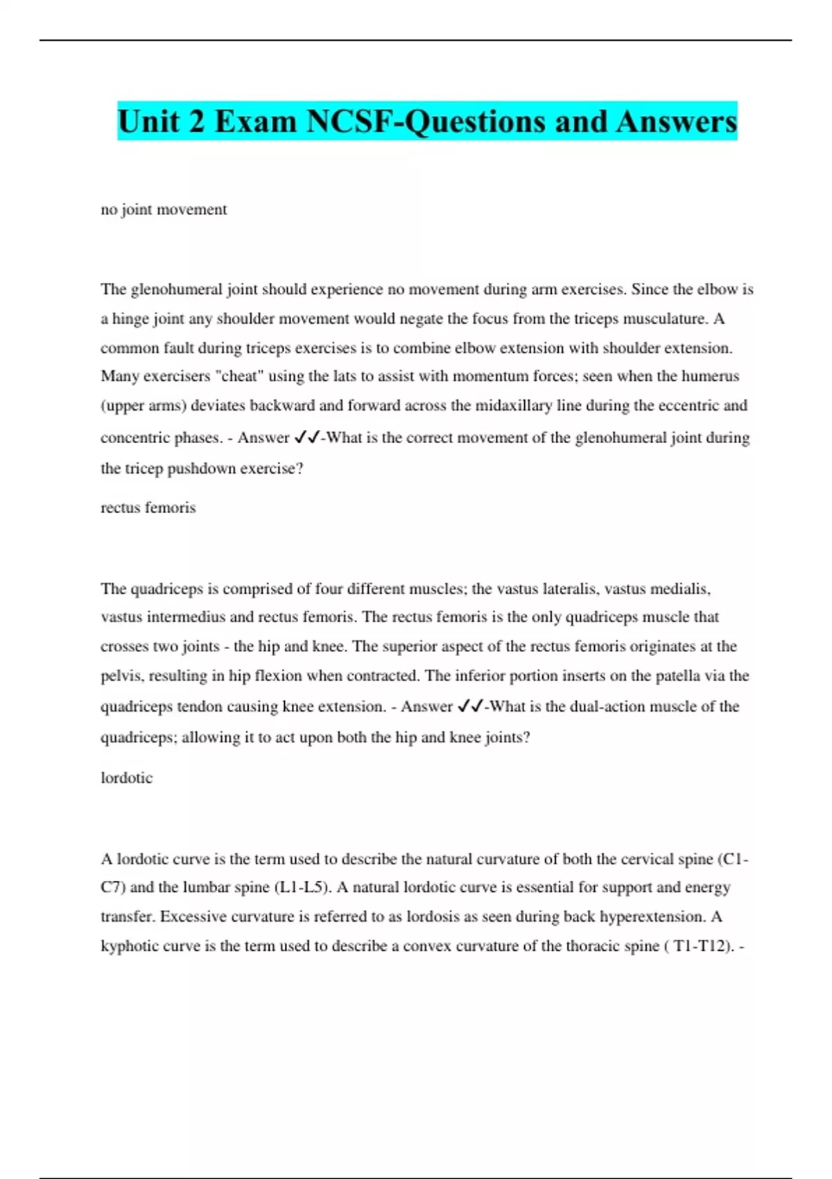 no joint movement The glenohumeral joint should experience no movement during arm exercises. Since the elbow is a hinge joint any shoulder movement would negate the focus from the triceps musculature. A common fault during triceps exercises is to combine elbow extension with shoulder extension. Many exercisers "cheat" using the lats to assist with momentum forces; seen when the humerus (upper arms) deviates backward and forward across the midaxillary line during the eccentric and concentric phases. - Answer ️️ -What is the correct movement of the glenohumeral joint during the tricep pushdown exercise? rectus femoris The quadriceps is comprised of four different muscles; the vastus lateralis, vastus medialis, vastus intermedius and rectus femoris. The rectus femoris is the only quadriceps muscle that crosses two joints - the hip and knee. The superior aspect of the rectus femoris originates at the pelvis, resulting in hip flexion when contracted. The inferior portion inserts on the patella via the quadriceps tendon causing knee extension. - Answer ️️ -What is the dual-action muscle of the quadriceps; allowing it to act upon both the hip and knee joints? lordotic A lordotic curve is the term used to describe the natural curvature of both the cervical spine (C1- C7) and the lumbar spine (L1-L5). A natural lordotic curve is essential for support and energy transfer. Excessive curvature is referred to as lordosis as seen during back hyperextension. A kyphotic curve is the term used to describe a convex curvature of the thoracic spine ( T1-T12).