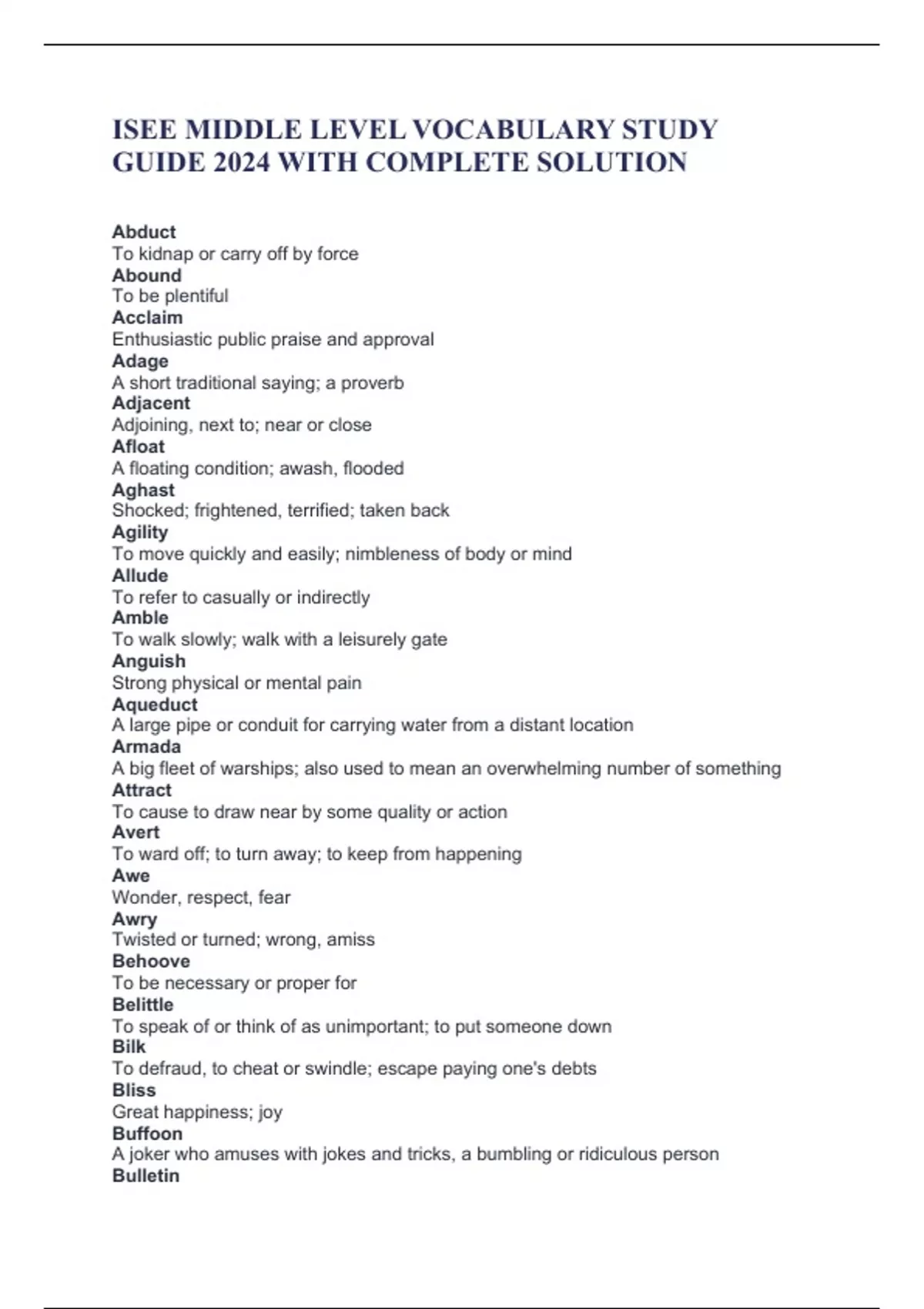 ISEE MIDDLE LEVEL VOCABULARY STUDY GUIDE 2024 WITH COMPLETE SOLUTION Abduct To kidnap or carry off by force Abound To be plentiful Acclaim Enthusiastic public praise and approval Adage A short traditional saying; a proverb Adjacent Adjoining, next to; near or close Afloat A floating condition; awash, flooded Aghast Shocked; frightened, terrified; taken back Agility To move quickly and easily; nimbleness of body or mind Allude To refer to casually or indirectly Amble To walk slowly; walk with a leisurely gate Anguish Strong physical or mental pain Aqueduct A large pipe or conduit for carrying water from a distant location Armada A big fleet of warships; also used to mean an overwhelming number of something Attract To cause to draw near by some quality or action Avert To ward off; to turn away; to keep from happening Awe Wonder, respect, fear Awry Twisted or turned; wrong, amiss Behoove To be necessary or proper for Belittle To speak of or think of as unimportant; to put someone down Bilk To defraud, to cheat or swindle; escape paying one's debts Bliss Great happiness; joy Buffoon A joker who amuses with jokes and tricks, a bumbling or ridiculous person Bulletin
