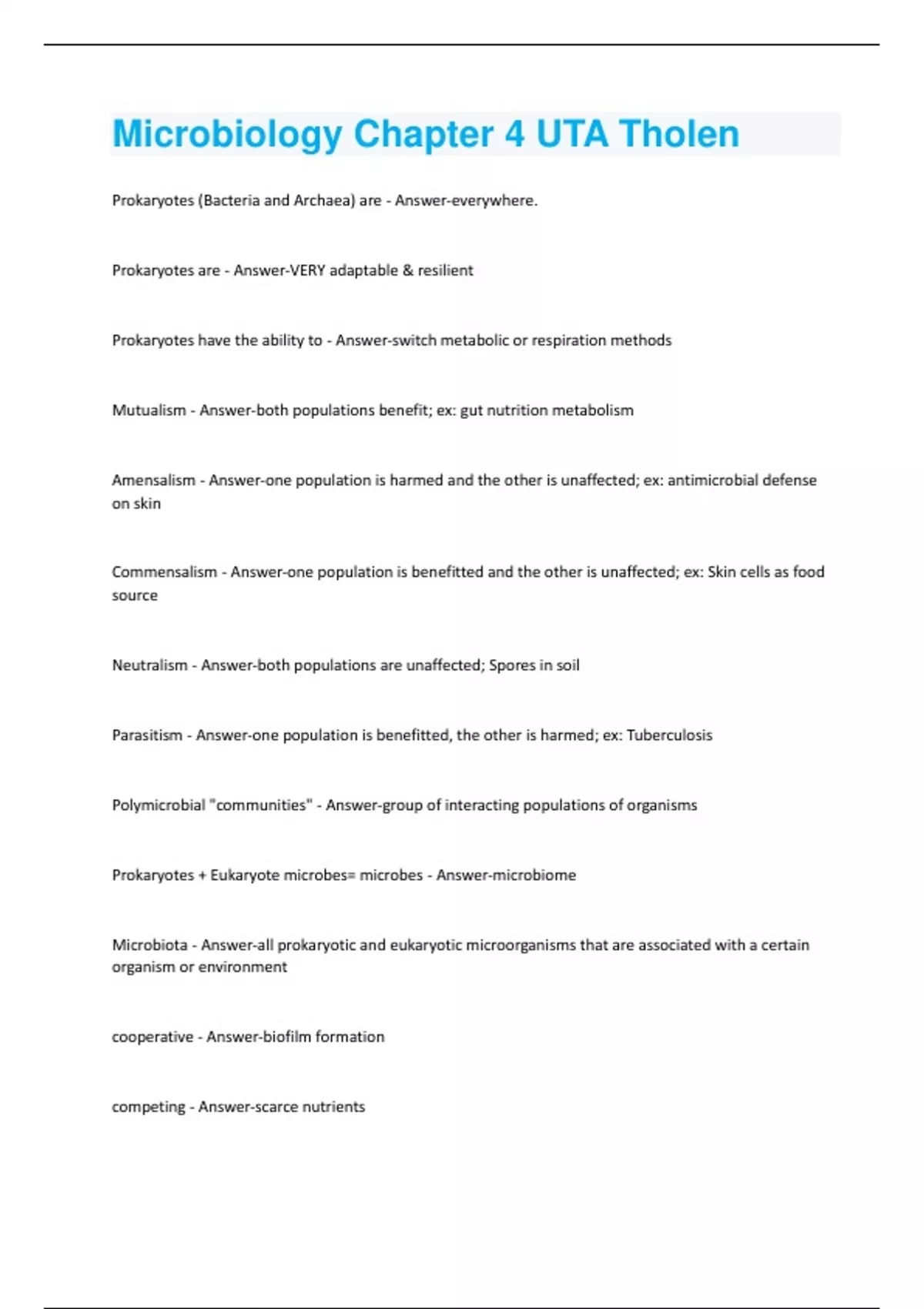 Prokaryotes (Bacteria and Archaea) are - Answer-everywhere. Prokaryotes are - Answer-VERY adaptable & resilient Prokaryotes have the ability to - Answer-switch metabolic or respiration methods Mutualism - Answer-both populations benefit; ex: gut nutrition metabolism Amensalism - Answer-one population is harmed and the other is unaffected; ex: antimicrobial defense on skin Commensalism - Answer-one population is benefitted and the other is unaffected; ex: Skin cells as food source Neutralism - Answer-both populations are unaffected; Spores in soil Parasitism - Answer-one population is benefitted, the other is harmed; ex: Tuberculosis Polymicrobial "communities" - Answer-group of interacting populations of organisms Prokaryotes + Eukaryote microbes= microbes - Answer-microbiome Microbiota - Answer-all prokaryotic and eukaryotic microorganisms that are associated with a certain organism or environment cooperative - Answer-biofilm formation competing - Answer-scarce nutrientsResident microbiota - Answer-microorganisms that constantly live in/on our bodies transient microbiota - Answer-microorganisms temporarily found in the human body, may include pathogenic microorganisms prokaryotes - Answer-don't reproduce sexually; classified by stains BEST APPROACH to prokaryotes - Answer-molecular + biochemical + microscopy Standard for bacterial taxonomy - Answer-Bergey's Manual of Systemic Bacteriology Largest collection of microbes available - Answer-American Type Culture Collection gram positive prokaryotes - Answer-LOW guanine-cytosine nucleotides; HIGH G-C gram negative prokaryotes - Answer-proteobacteria and spirochetes Atypical - Answer-neither Alphaproteobacteria - Answer-Oliotrophs live in low nutrients environments; Chlamydia & Rickettsia are prominent genera (Obligate intracellular and must have a host to be metabolically active) Alphaproteobacteria: Rickettsia - Answer-causative agents for Rocky mountain spotted fever & typhus fevers Alphaproteobacteria: Chlamydia - Answer-causative agents for lymphogranuloma venereum (STD) Betoproteobacteria - Answer-Eutrophs require many nutrients; prominent genera include Bordetella and NeisseriaBetoproteobacteria: Bordetella - Answer-causative agents whooping (pertussis) cough; produces toxins to paralyze lung cilia Betoproteobacteria: Neisseria gonorrhea - Answer-causative agent for gonorrhea STD Betoproteobacteria: Neisseria meningitides - Answer-causative agent for bacterial meningitis