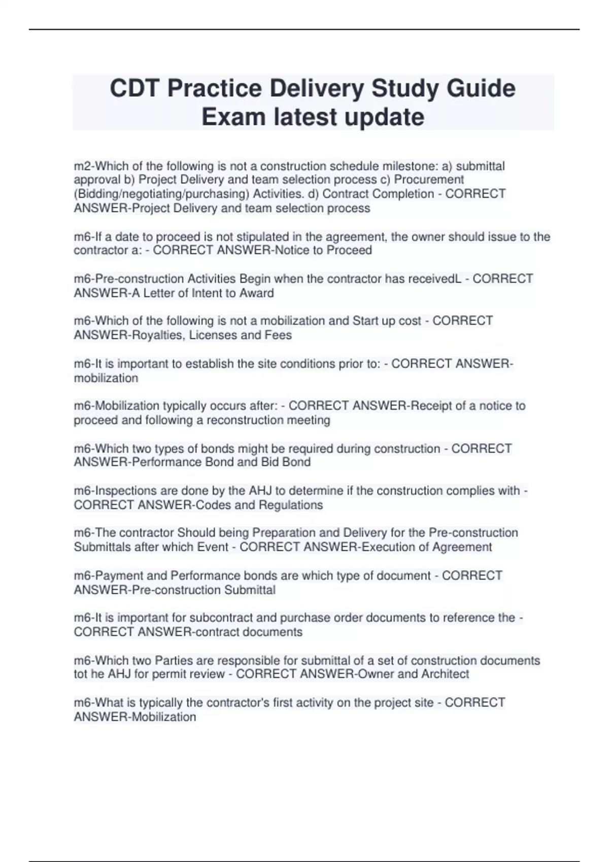 CDT Practice Delivery Study Guide Exam latest update m2-Which of the following is not a construction schedule milestone: a) submittal approval b) Project Delivery and team selection process c) Procurement (Bidding/negotiating/purchasing) Activities. d) Contract Completion - CORRECT ANSWER-Project Delivery and team selection process m6-If a date to proceed is not stipulated in the agreement, the owner should issue to the contractor a: - CORRECT ANSWER-Notice to Proceed m6-Pre-construction Activities Begin when the contractor has receivedL - CORRECT ANSWER-A Letter of Intent to Award m6-Which of the following is not a mobilization and Start up cost - CORRECT ANSWER-Royalties, Licenses and Fees m6-It is important to establish the site conditions prior to: - CORRECT ANSWERmobilization m6-Mobilization typically occurs after: - CORRECT ANSWER-Receipt of a notice to proceed and following a reconstruction meeting m6-Which two types of bonds might be required during construction - CORRECT ANSWER-Performance Bond and Bid Bond m6-Inspections are done by the AHJ to determine if the construction complies with - CORRECT ANSWER-Codes and Regulations m6-The contractor Should being Preparation and Delivery for the Pre-construction Submittals after which Event - CORRECT ANSWER-Execution of Agreement m6-Payment and Performance bonds are which type of document - CORRECT ANSWER-Pre-construction Submittal m6-It is important for subcontract and purchase order documents to reference the - CORRECT ANSWER-contract documents m6-Which two Parties are responsible for submittal of a set of construction documents tot he AHJ for permit review - CORRECT ANSWER-Owner and Architect m6-What is typically the contractor's first activity on the project site - CORRECT ANSWER-Mobilization m7According to the AIA A201 The contractor has sole responsibility and control over the following construction activities - CORRECT ANSWER-Means, methods, techniques, sequences, procedures, coordination, job site safety m7The responsibility of inspecting work already performed for proper conditions to receive subsequent work lies with the - CORRECT ANSWER-Contractor M7- The contractor's superintendent: - CORRECT ANSWER-Can not be changed without the owners consent and communication is as binding as if given by the contractor m7- True or False - by executing the contract the contractor confirms that the contract time is reasonable - CORRECT ANSWER-True m7- The date of substantial completion is established by the - CORRECT ANSWERA/E `m7- Under A201 who has the responsibility to pay sales, consumer, use and similar taxes for the work provided? - CORRECT ANSWER-contractor m-7If the contractor is delayed in the progress of the work by the owner the contractor should: - CORRECT ANSWER-Write the A/E requesting a change order granting an extension of time. m7- Product equivalency, manufacturer, installation, operating cost, maintenance costs, and warranty are major factors to be considered for: - CORRECT ANSWERSubstitution Request m7- All of the following my be accomplished through issuing change order except which one? a) Change in bid date. b)Decr