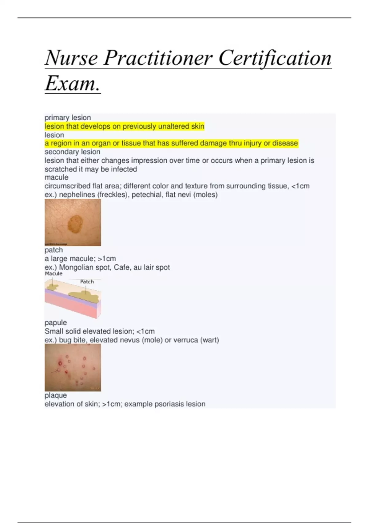 Abscess a localized collection of purulent fluid in a cavity formed by disintegration or necrosis of tissues >1cm tumor "MASS: > few cm in diameter; firm or soft; benign or malignant configuration: annular circular, begins in center and spreads to periphery configuration: confluent lesions run together configuration: grouped lesion cluster configuration: gyrate twisted, coiled, spiral and snake like configuration: linear scratch, streak, line stripe configuration: polycyclic annular lesions merge configuration: solitary or discrete individual and distinct lesions that remain separate configuration: target (iris) resembles iris of eye; lesion with concentric rings of color configuration: zosteriform linear arrangement along nerve route comedowns open are called black heads (openings capped with a blackened skin debris); and closed are called white head (obstructed) acne can be comedowns, pustules, papules (pimples and zits), cysts, nodules and scaring no pharmacological management of acne wash several times daily with soap and water; avoid topical oil based; use oil free cleansers and moisturizers pharmacological management of acne