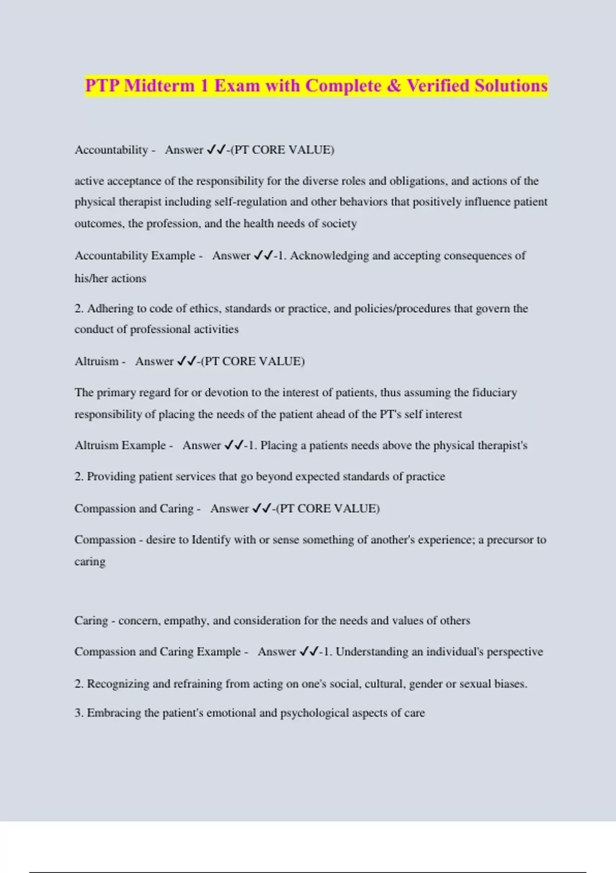 PTP Midterm 1 Exam with Complete & Verified Solutions Accountability - Answer ️️ -(PT CORE VALUE) active acceptance of the responsibility for the diverse roles and obligations, and actions of the physical therapist including self-regulation and other behaviors that positively influence patient outcomes, the profession, and the health needs of society Accountability Example - Answer ️️ -1. Acknowledging and accepting consequences of his/her actions 2. Adhering to code of ethics, standards or practice, and policies/procedures that govern the conduct of professional activities Altruism - Answer ️️ -(PT CORE VALUE) The primary regard for or devotion to the interest of patients, thus assuming the fiduciary responsibility of placing the needs of the patient ahead of the PT's self interest Altruism Example - Answer ️️ -1. Placing a patients needs above the physical therapist's 2. Providing patient services that go beyond expected standards of practice Compassion and Caring - Answer ️️ -(PT CORE VALUE) Compassion - desire to Identify with or sense something of another's experience; a precursor to caring Caring - concern, empathy, and consideration for the needs and values of others Compassion and Caring Example - Answer ️️ -1. Understanding an individual's perspective 2. Recognizing and refraining from acting on one's social, cultural, gender or sexual biases. 3. Embracing the patient's emotional and psychological aspects of car