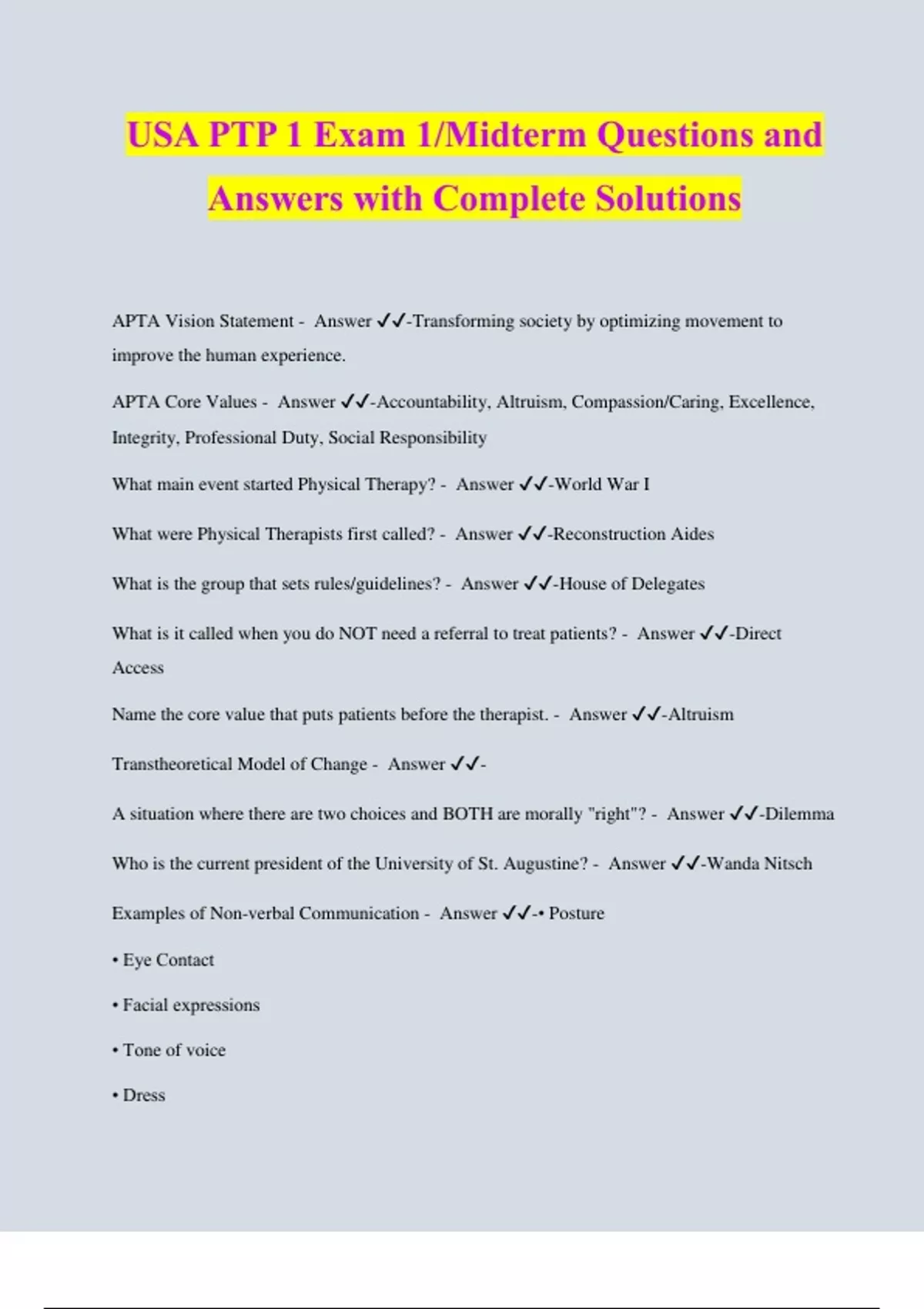 USA PTP 1 Exam 1/Midterm Questions and Answers with Complete Solutions