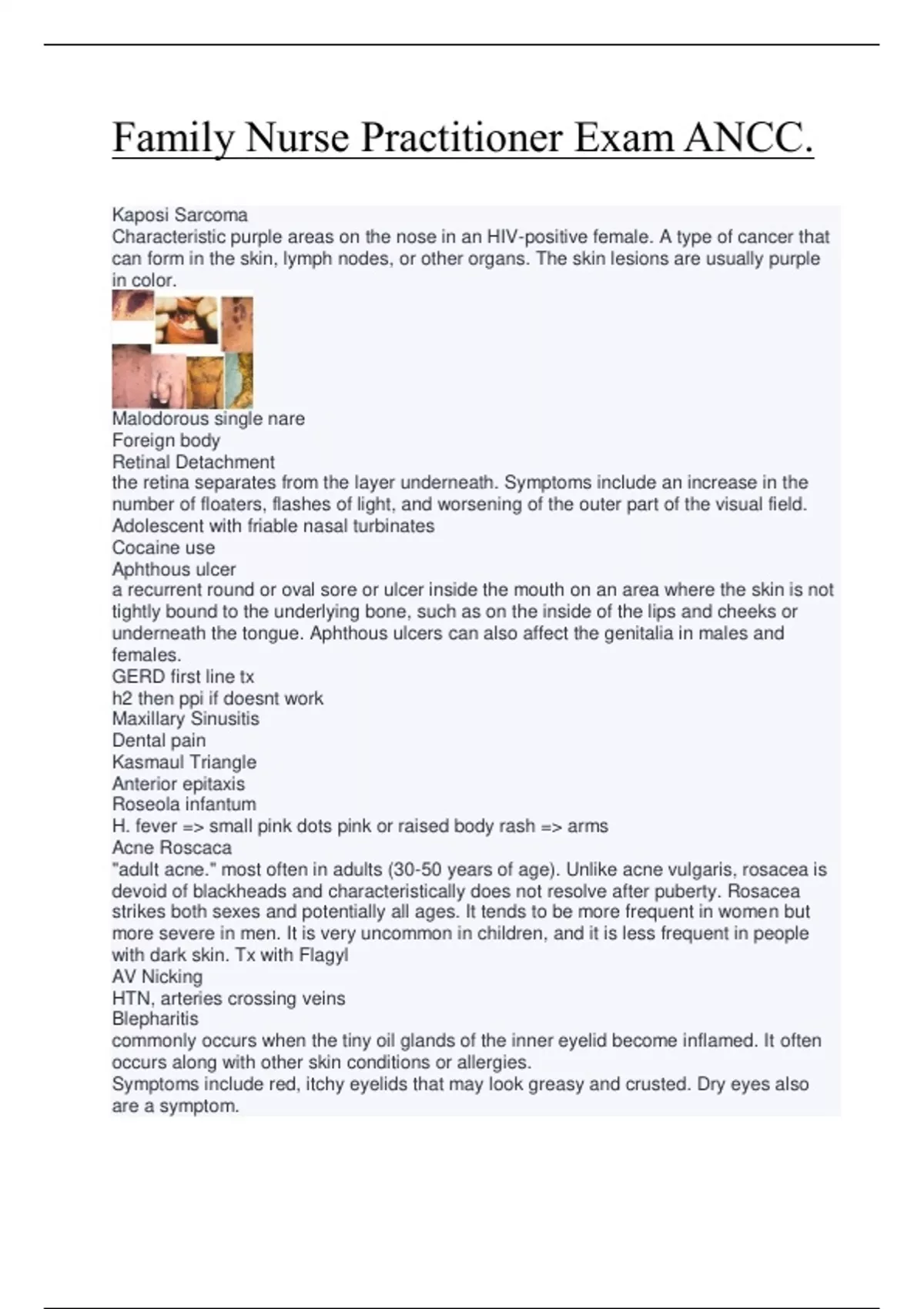 H. fever => small pink dots pink or raised body rash => arms Acne Roscaca "adult acne." most often in adults (30-50 years of age). Unlike acne vulgaris, rosacea is devoid of blackheads and characteristically does not resolve after puberty. Rosacea strikes both sexes and potentially all ages. It tends to be more frequent in women but more severe in men. It is very uncommon in children, and it is less frequent in people with dark skin. Tx with Flagyl AV Nicking HTN, arteries crossing veins Blepharitis commonly occurs when the tiny oil glands of the inner eyelid become inflamed. It often occurs along with other skin conditions or allergies. Symptoms include red, itchy eyelids that may look greasy and crusted. Dry eyes also are a symptom.