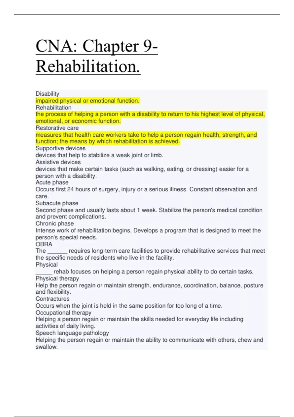 The ______ requires long-term care facilities to provide rehabilitative services that meet the specific needs of residents who live in the facility. Physical _____ rehab focuses on helping a person regain physical ability to do certain tasks. Physical therapy Help the person regain or maintain strength, endurance, coordination, balance, posture and flexibility. Contractures Occurs when the joint is held in the same position for too long of a time. Occupational therapy Helping a person regain or maintain the skills needed for everyday life including activities of daily living. Speech language pathology Helping the person regain or maintain the ability to communicate with others, chew and swallow.
