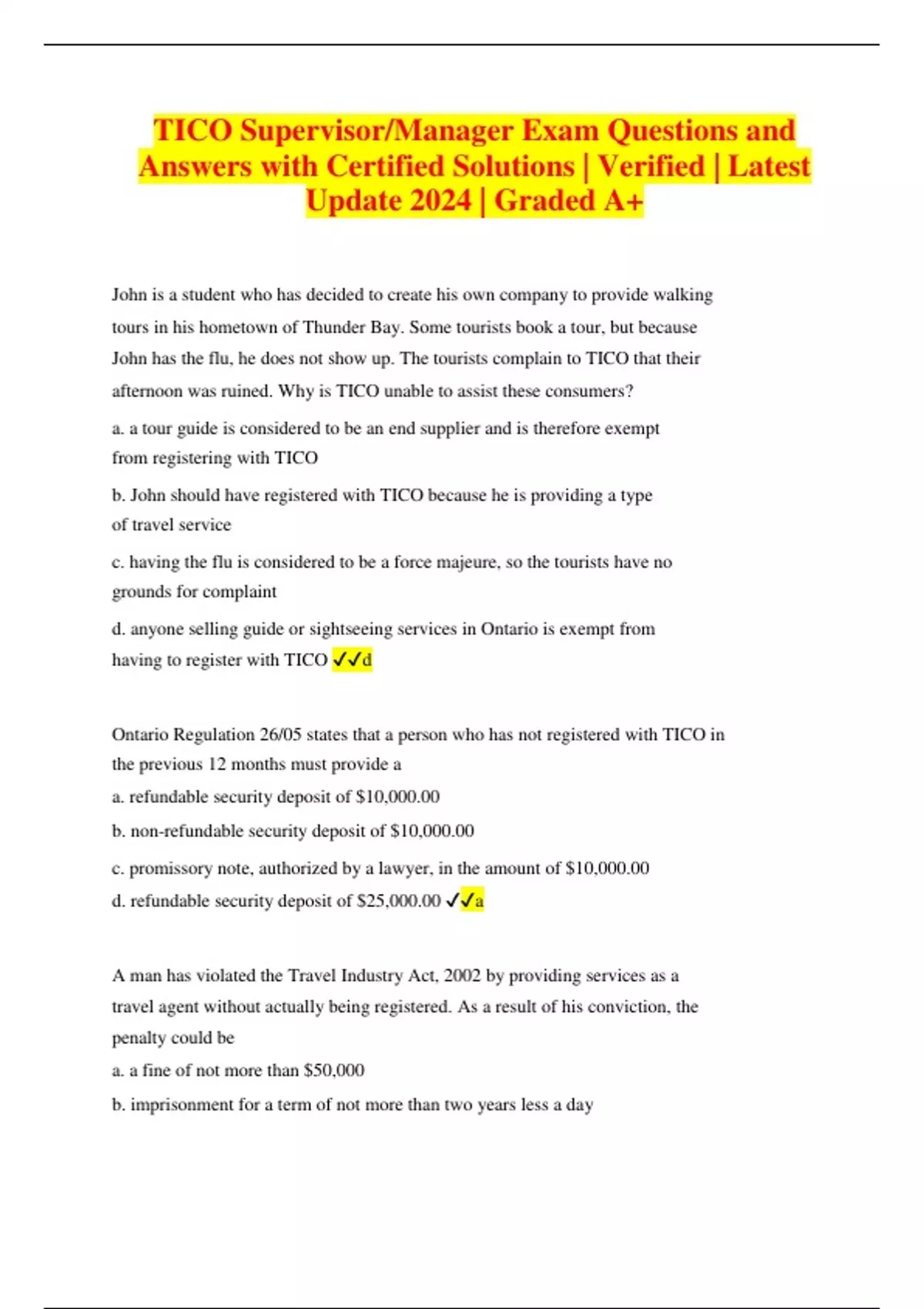 John is a student who has decided to create his own company to provide walking tours in his hometown of Thunder Bay. Some tourists book a tour, but because John has the flu, he does not show up. The tourists complain to TICO that their afternoon was ruined. Why is TICO unable to assist these consumers? a. a tour guide is considered to be an end supplier and is therefore exempt from registering with TICO b. John should have registered with TICO because he is providing a type of travel service c. having the flu is considered to be a force majeure, so the tourists have no grounds for complaint d. anyone selling guide or sightseeing services in Ontario is exempt from having to register with TICO d Ontario Regulation 26/05 states that a person who has not registered with TICO in the previous 12 months must provide a a. refundable security deposit of $10,000.00 b. non-refundable security deposit of $10,000.00 c. promissory note, authorized by a lawyer, in the amount of $10,000.00 d. refundable security deposit of $25,000.00 a