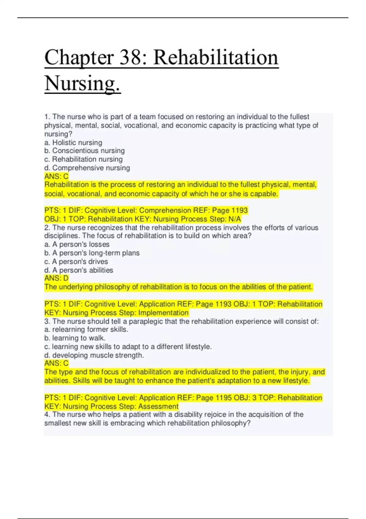 d. developing muscle strength. ANS: C The type and the focus of rehabilitation are individualized to the patient, the injury, and abilities. Skills will be taught to enhance the patient's adaptation to a new lifestyle. PTS: 1 DIF: Cognitive Level: Application REF: Page 1195 OBJ: 3 TOP: Rehabilitation KEY: Nursing Process Step: Assessment 4. The nurse who helps a patient with a disability rejoice in the acquisition of the smallest new skill is embracing which rehabilitation philosophy? a. Resolving impairments b. Removing disabilities c. Increasing quality of life d. Eliminating complications ANS: C A philosophy of rehabilitation is to increase the quality of life. Impairments may not be able to be resolved, disabilities may not be able to be completely removed, and complications may not be totally eliminated. However, with rehabilitation, the individual can learn to adjust to the new lifestyle. PTS: 1 DIF: Cognitive Level: Application REF: Page 1195 OBJ: 1 TOP: Rehabilitation KEY: Nursing Process Step: Implementation 5. A patient with quadriplegia resulting from a spinal cord injury says to the rehabilitation nurse, "I'm sick of this therapy! What is an occupational therapist going to do for me? Can she give me an 'occupation'?" What response by the nurse would be the most helpful? a. "No, but the occupational therapist can show you how to enjoy some recreational activities." b. "Yes, in a way. The occupational therapist provides training that strengthens muscles you can still control." c. "Maybe. The occupational therapist recommends adaptive equipment that will make you more independent." d. "No, the voc-rehab counselor helps with employment. The occupational therapist helps train you for improved communication skills." ANS: C The occupational therapist recommends adaptive equipment or helps in modifying skills to enhance independence. PTS: 1 DIF: Cognitive Level: Analysis REF: Page 1196, Table 38-1 OBJ: 4 TOP: Rehabilitation KEY: Nursing Process Step: Implementation 6. When caring for a patient with a disability, the rehabilitation nurse provides individual treatment to help the patient stay focused on which goals? a. Returning to normal b. Independence c. Employment d. Promotion of health