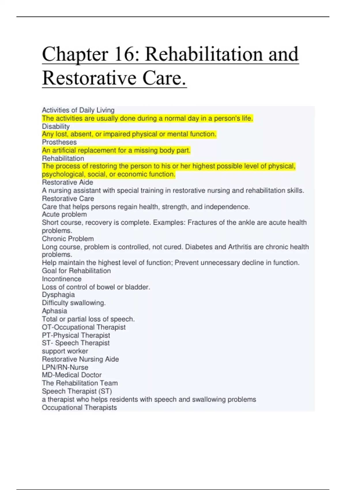 Assist patient's with ADL's. Focus on the waist up. Physical Therapists Assisting patients with Ambulation. Focus on the waist down. The person first seeks health care. Rehabilitation begins when: The whole person! Rehabilitation and Restorative Care focus on: Pity and Sympathy. Show CONCERN, NOT pity! What types of attitudes will NOT help a person in Rehabilitation Adjust? rehabilitation care members of the team vary depending on person's needs emphasis on the whole person illness and disability affects all detentions of health orthoses apparatus worn to support, align, prevent, or correct deformity (splints, braces...) self-care device help with bathing, dressing, cooking... devices to aid mobility crutches, canes, wheelchairs, braces... eating and drinking devices these include glass holders, plate guards, and utensils with curved handles or cuffs older adults rehabilitation is often slower for: to restore function to former levels which of the following is common goal of rehabilitation? physiotherapist evaluated strength, flexibility, and balance; taught mobility exercises and equipment use the whole person the rehabilitation process addresses: in the variety of facility and community settings