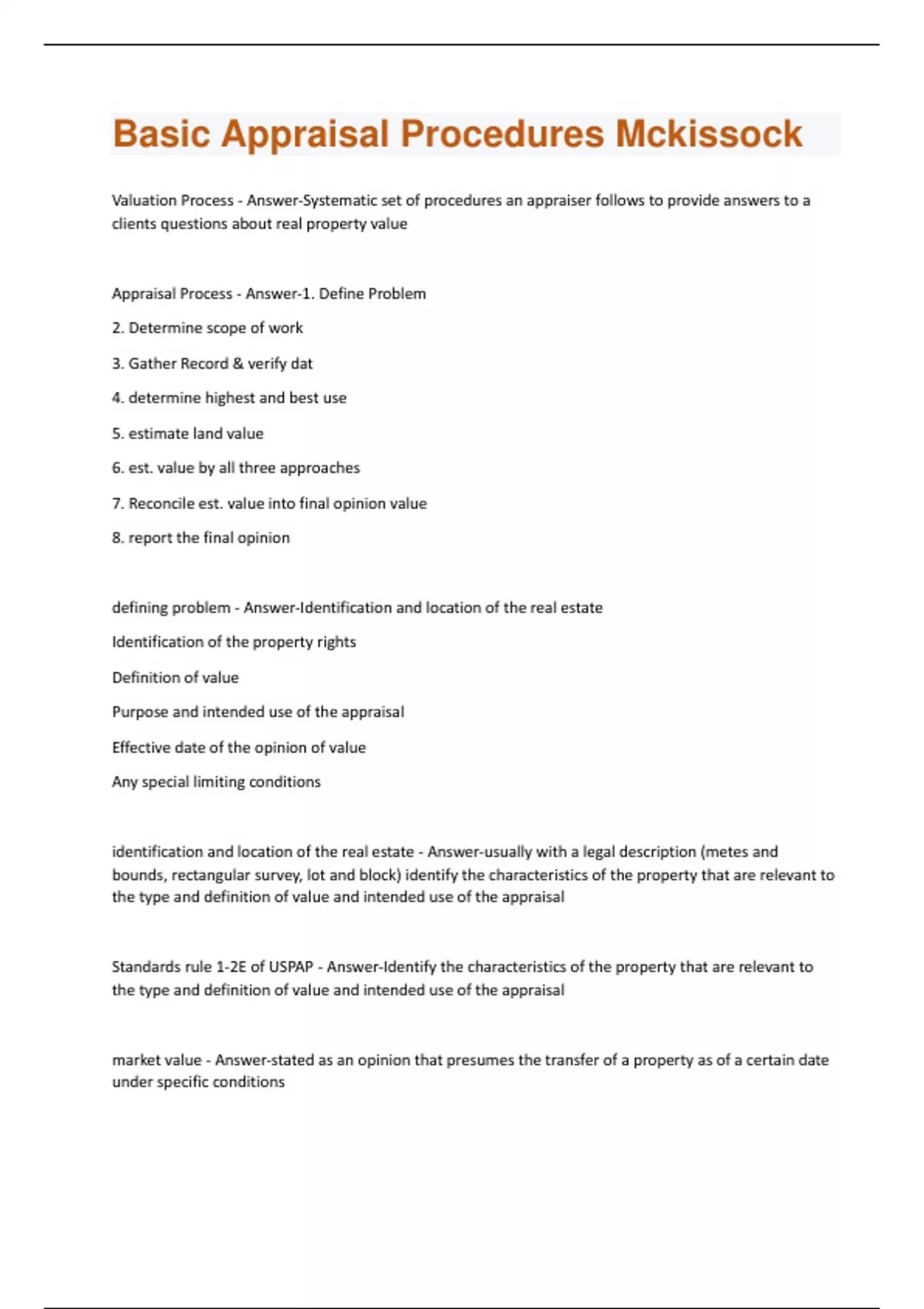Valuation Process - Answer-Systematic set of procedures an appraiser follows to provide answers to a clients questions about real property value Appraisal Process - Answer-1. Define Problem 2. Determine scope of work 3. Gather Record & verify dat 4. determine highest and best use 5. estimate land value 6. est. value by all three approaches 7. Reconcile est. value into final opinion value 8. report the final opinion defining problem - Answer-Identification and location of the real estate Identification of the property rights Definition of value Purpose and intended use of the appraisal Effective date of the opinion of value Any special limiting conditions identification and location of the real estate - Answer-usually with a legal description (metes and bounds, rectangular survey, lot and block) identify the characteristics of the property that are relevant to the type and definition of value and intended use of the appraisal Standards rule 1-2E of USPAP - Answer-Identify the characteristics of the property that are relevant to the type and definition of value and intended use of the appraisal market value - Answer-stated as an opinion that presumes the transfer of a property as of a certain date under specific conditionsAppraisers are cautioned to - Answer-identify the exact definition of market value and its authority applicable in each appraisal completed for the purpose of market value Standards 1-2c of USPAP - Answer-identify type of value, if opinion to be developed market value, ascertain whether the value is to be the most probable price: terms of cash; terms of financial arrangements equ. to cahs; other terms; if not market value must be clearly identified purpose of the assignment - Answer-objective of assignment. ex: to develop an opinion of the defined value of a specified interest in real estate intended user - Answer-client and any other party as identified by name or type as users of the appraisal review report by the appraiser retrospective and prospective value - Answer-Two dates are essential to an appraisal report. Standards Rules 2-2(a)(vi) and 2-2(b)(vi) and 8-2(a)(vi) and 8-2(b)(vi) require that each appraisal report specify the effective date of the appraisal and the date of the report standards 1-2d of USPAP - Answer-identify the effective date of the appraisers opinions and conclusions extraordinary assumption - Answer-an assignment specific assumption as of the effective date if which found to be false could alter the appraisers opinions or conclusions hypothetical edition - Answer-condition directly related to specific assignment which is contrary to what is known by the appraiser to exist on the effective date of assignment results but is used for the purpose of analysis Advisory opinions-22 os USPAP - Answer-Accomplishing the first four action steps (SR 1-2(a) through (d))... ...provides the basis for deciding which of the property's characteristics are relevant in the assignment determine scope of work - Answer-the type and extent of research and analysis or appraisal review assignmentadvisory opinion-22 - Answer-understanding whihc analysis methods and techniques are necessary and what data are necessary to correctly complete the analysis is an integral part of the scope of work decision standards rule 1-2h of USPAP - Answer-determine the scope of work necessary to produce credible results in accordance with the SCOPE OF WORK RULE scope of work rule - Answer-identify problem; determine and perform the scope of work necessary to develop credible assignment results; disclose scope of work in the report scope of work includes but is not limited to: - Answer-the extent to which the property is identified; the extent to which tangible property is inspected; the type and extent of data researched; and the type and extent of analyses applied to arrive at opinions or conclusions. standards rule 2-2a in USPAP - Answer-summarize the scope of work used to develop the appraisal workfile - Answer-documentation necessary to support an appraiser's analyses, opinions, and conclusions record keeping rule - Answer-an appraiser must prepare a workfile for each appraisal or appraisal review assignment workfile must include - Answer-name of client and identity by name or type of any other users; true copies of all written reports, documented on any type of media; summaries of any oral reports or testimony, or a transcript of testimony, including the appraiser's signed and dated certification; all other data, information, and documentation necessary to support the appraiser's opinions and conclusions and to show compliance with USPAP how long does an appraiser have to keep his workfile - Answer-at least 5 hyears after peperation or at least two years after final disposition of any judicial proceeding in which had to testifyworkfile custody access and retrieval - Answer-An appraiser must have custody of his or her workfile, or make appropriate workfile retention, access, and retrieval arrangements with the party having custody of the workfile verify - Answer-to prove the truth of by the presentation of evidence or testimony verification - Answer-process of validating or estab. the truth about info from another source which is critical to credibility the highest and best use of a property must be: - Answer-legally permissible, physically, possible, financially feasible, and maximally productive applicable approaches to value - Answer-cost, sales comp, income and capitalization appraoches reconciliation - Answer-come to one reasoned opinion of value at the effective date general data - Answer-data that relates to the four forces that affect real property values social economic governmental and environmental forces (macr0-level data) specific data - Answer-details about property's being appraised national association of homebuilders - Answer-does extensive research on current construction trends and figures National Association of REALTORS - Answer-trade association for real estate a