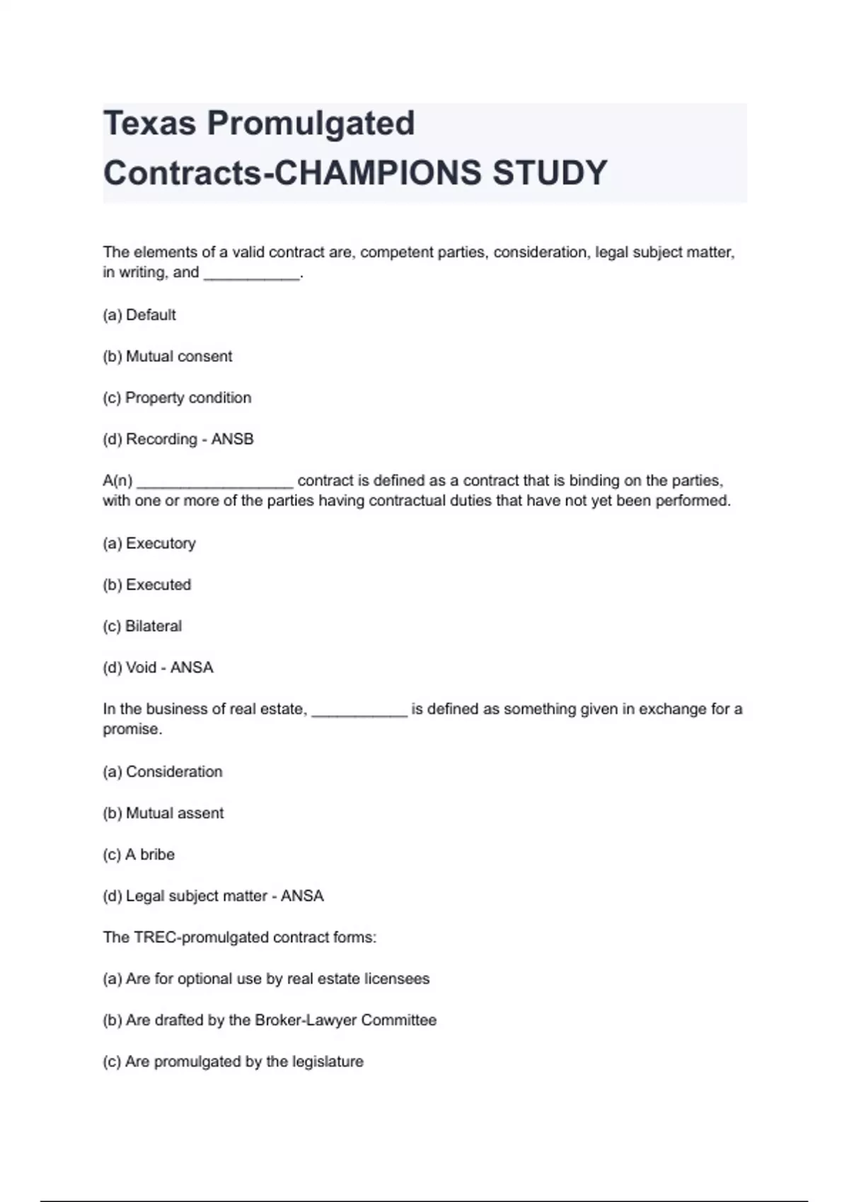 Texas Promulgated Contracts-CHAMPIONS STUDY questions and answers graded A+ 2024/2025