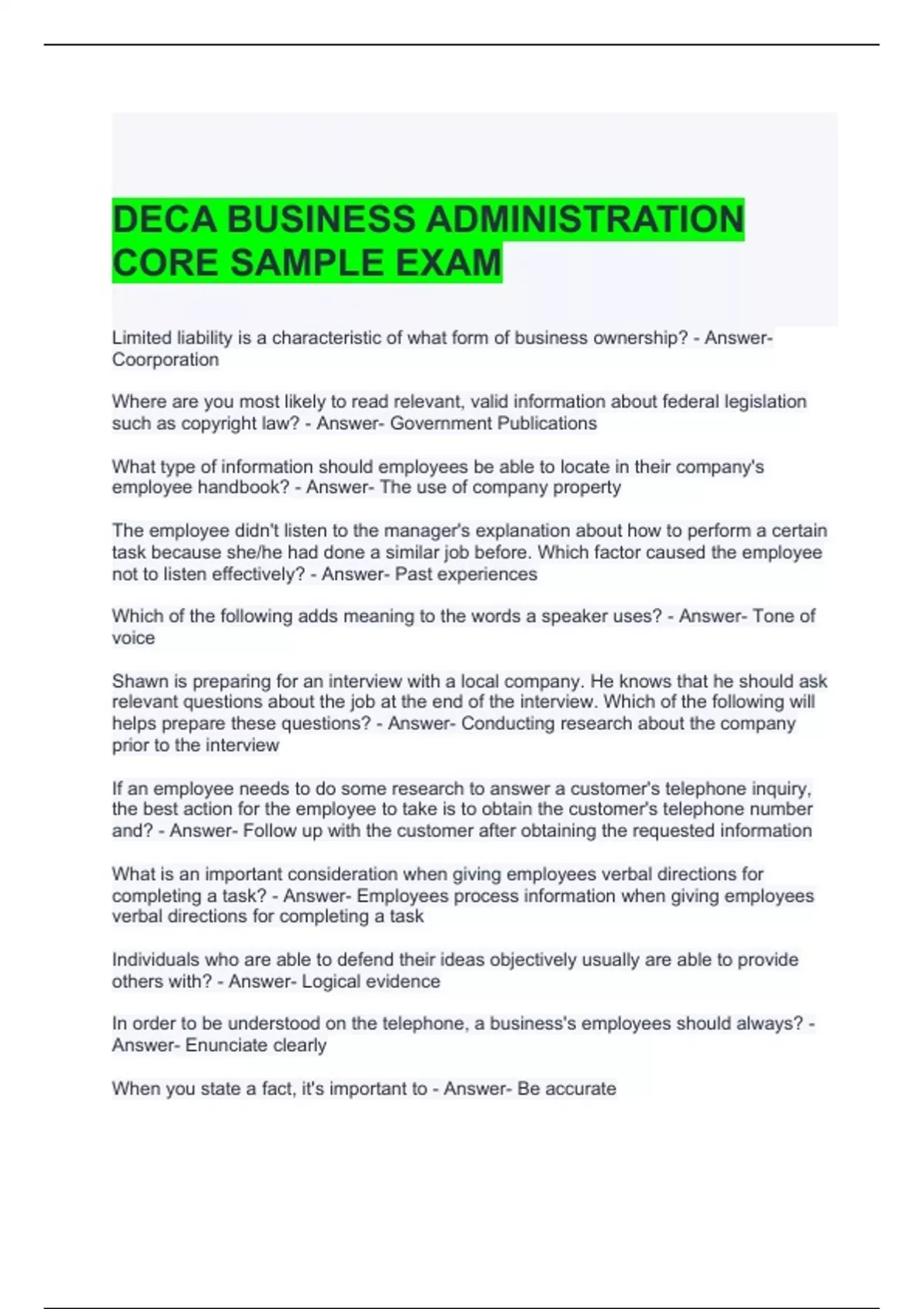 DECA BUSINESS ADMINISTRATION CORE SAMPLE EXAM 2024 QUESTIONS AND ANSWERS