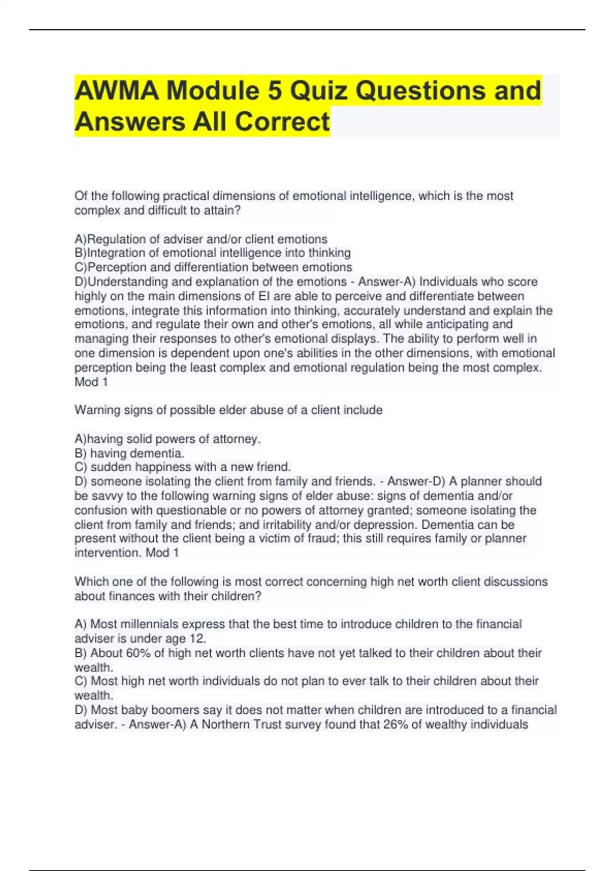 AWMA Module 5 Quiz Questions and Answers All Correct Of the following practical dimensions of emotional intelligence, which is the most complex and difficult to attain? A)Regulation of adviser and/or client emotions B)Integration of emotional intelligence into thinking C)Perception and differentiation between emotions D)Understanding and explanation of the emotions - Answer-A) Individuals who score highly on the main dimensions of EI are able to perceive and differentiate between emotions, integrate this information into thinking, accurately understand and explain the emotions, and regulate their own and other's emotions, all while anticipating and managing their responses to other's emotional displays. The ability to perform well in one dimension is dependent upon one's abilities in the other dimensions, with emotional perception being the least complex and emotional regulation being the most complex. Mod 1 Warning signs of possible elder abuse of a client include A)having solid powers of attorney. B) having dementia. C) sudden happiness with a new friend. D) someone isolating the client from family and friends. - Answer-D) A planner should be savvy to the following warning signs of elder abuse: signs of dementia and/or confusion with questionable or no powers of attorney granted; someone isolating the client from family and friends; and irritability and/or depression. Dementia can be present without the client being a victim of fraud; this still requires family or planner intervention. Mod 1 Which one of the following is most correct concerning high net worth client discussions about finances with their children? A) Most millennials express that the best time to introduce children to the financial adviser is under age 12. B) About 60% of high net worth clients have not yet talked to their children about their wealth. C) Most high net worth individuals do not plan to ever talk to their children about their wealth. D) Most baby boomers say it does not matter when children are introduced to a financial adviser. - Answer-A) A Northern Trust survey found that 26% of wealthy individuals have not yet talked to their children about wealth and some (not most) do not plan to ever do so. A Spectrem study shows that 54% of millennials say that under age 12 is the best age to introduce a financial planner. Considering the average of all demographic categories, and that of baby boomers, the ages 18 to 25 group was found to be the ideal time to introduce a financial adviser. Mod 1 Which one of the following is most important in establishing trust with a client? A) Being associated with a good financial company B)Having a pleasant manner C)Demonstrating professional knowledge D)Being genuine and following best practices - Answer-D) Being genuine and following best practices are two of the most important factors in establishing trust with a client. Mod 1 Which one of the following is a question that a wealth adviser could best pose to clients when starting a conversation about family matters? A)Do you exclude family members from learning about or participating in decisions related to the family's business or wealth? B)Do you fight when the family communicates about wealth matters? C)Are there any major transitions that are important? D)What steps has the family taken to ensure that family members are financially fluent and well positioned to serve as responsible stewards of wealth? - Answer-D) When starting a discourse with a wealthy client, the questions about family matters should be open-ended and not leading clients to answer a certain way. Mod 1 Which one of the following is a regulation that allows members to put a temporary hold on disbursements from an elder account if elder abuse is suspected? A)Elder Justice Initiative B) FINRA Rule 4512 C) FINRA Rule 2165 D) Senior Safe Act - Answer-C) FINRA Rule 2165 goes beyond the Senior Safe Act in not only detecting financial abuse, but allowing an adviser to put a temporary hold (up to 25 days) on disbursements from an elder account (over 65) if financial abuse is suspected to be present or commencing. FINRA Rule 4512 requires financial advisers to make a "reasonable effort" to collect the name of a "trusted contact person." The Elder Justice Initiative supports and coordinates the Department of Justice's enforcement and programmatic efforts to combat elder abuse, neglect, and financial fraud and scams. Mod 1 When the personal circumstances of a client change, to which wealth management step does the investment professional return? A)Data gathering and goal establishment B)Analyzing and evaluating the client's financial status C)Monitoring financial planning recommendations D)Implementing financial planning recommendations - Answer-A) In Step 2 of the wealth adviser financial planning process, advisers discover client goals and gather financial data about the client. If there is a major event in the client's life, then planners should come back to this goal-setting, data-gathering step. Mod 1 Compared to those planners working alone, advisers working with a team generally have A)more assets under management but less revenue. B)more assets under management and more revenue. C) fewer assets under management but more revenue. D)fewer assets under management and less revenue. - Answer-B) Teamwork is a bonus for advisers, who, when compared to sole practitioners, generally have deeper client relationships, generate more assets and revenue, have lower attrition, and have a higher fee-based ratio. Mod 1 When working in a team at a financial institution, which one of the following is something an adviser would likely not do? A)Implement client recommendations B)Refer problems to another team member C)Collaborate with a customized team of specialists D)Develop and retain lasting client relationships - Answer-B) At a financial institution, advisers may need to develop and retain lasting client relationships, collaborate with a customized team of specialists, res