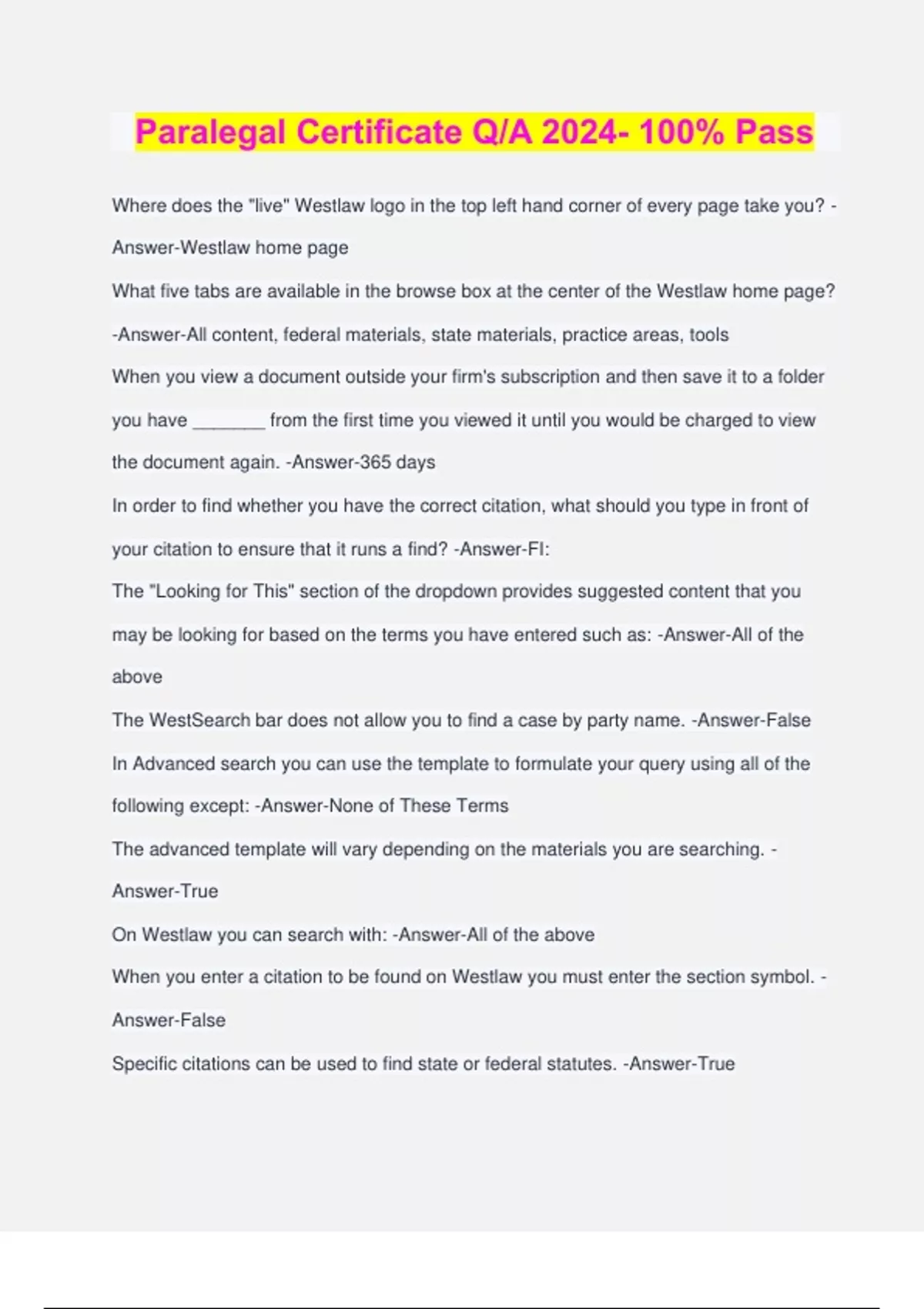 Paralegal Certificate Q/A 2024- 100% Pass Where does the "live" Westlaw logo in the top left hand corner of every page take you? - Answer-Westlaw home page What five tabs are available in the browse box at the center of the Westlaw home page? -Answer-All content, federal materials, state materials, practice areas, tools When you view a document outside your firm's subscription and then save it to a folder you have _______ from the first time you viewed it until you would be charged to view the document again. -Answer-365 days In order to find whether you have the correct citation, what should you type in front of your citation to ensure that it runs a find? -Answer-FI: The "Looking for This" section of the dropdown provides suggested content that you may be looking for based on the terms you have entered such as: -Answer-All of the above The WestSearch bar does not allow you to find a case by party name. -Answer-False In Advanced search you can use the template to formulate your query using all of the following except: -Answer-None of These Terms The advanced template will vary depending on the materials you are searching. - Answer-True On Westlaw you can search with: -Answer-All of the above When you enter a citation to be found on Westlaw you must enter the section symbol. - Answer-False Specific citations can be used to find state or federal statutes. -Answer-True