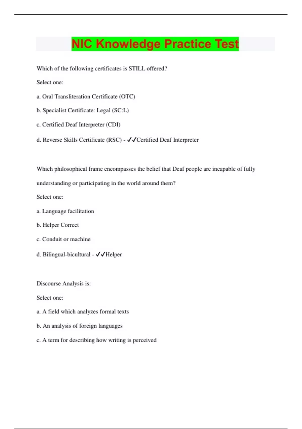 NIC Knowledge Practice Test Which of the following certificates is STILL offered? Select one: a. Oral Transliteration Certificate (OTC) b. Specialist Certificate: Legal (SC:L) c. Certified Deaf Interpreter (CDI) d. Reverse Skills Certificate (RSC) - Certified Deaf Interpreter Which philosophical frame encompasses the belief that Deaf people are incapable of fully understanding or participating in the world around them? Select one: a. Language facilitation b. Helper Correct c. Conduit or machine d. Bilingual-bicultural - Helper Discourse Analysis is: Select one: a. A field which analyzes formal texts b. An analysis of foreign languages c. A term for describing how writing is perceived d. A field which studies human communicative interaction - A field which studies human communicative interaction ASL most commonly employs a _________ sentence structure, whereas English uses a subject- predicate format Select one: a. Predicate-verb b. Topic-comment c. Hold-movement-hold d. Object-verb-subject - Topic Comment In which of the following settings would an interpreter be MOST likely to use transliteration? Select one: a. A medical appointment with a recent deaf immigrant b. A classroom with a deaf student who is late-deafened c. A job interview with a graduate of a residential school d. A prison interview between an illiterate suspect and his attorney - a classroom with a deaf student who is late-deafened The common language of the Black Deaf Community is Select one: a. Black English b. ASL c. Signed English d. Standard English - ASL Under the RID certification maintenance program, certified interpreters must complete an average of ___ hours of continuing education per year (0.1 CEU equals one hour) Select one: a. 10 b. 20 c. 30 d. 40 - 20 Deaf members of ethnic minorities in the United States have historically Select one: a. Been treated well by white Deaf people b. Been subject to the same kinds of discrimination as non-Deaf minorities c. Had their own separate signed languages instead