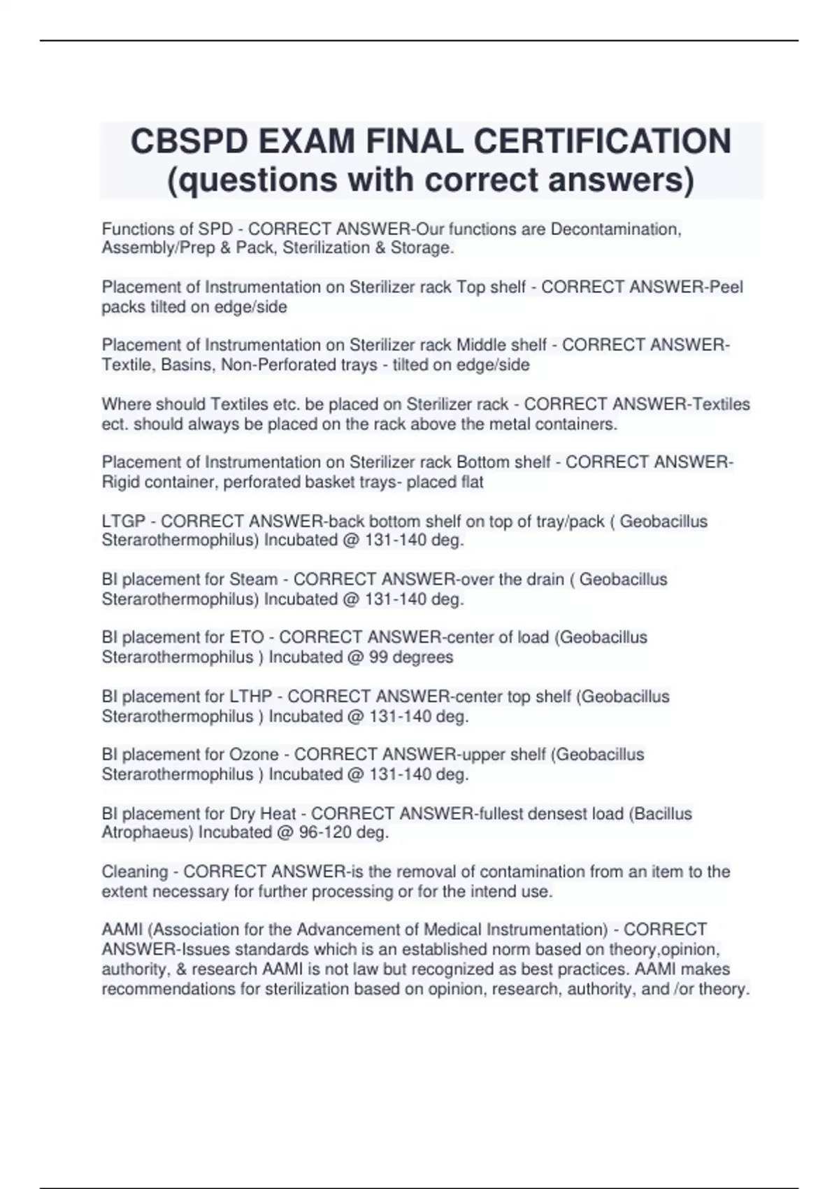 CBSPD EXAM FINAL CERTIFICATION (questions with correct answers) Functions of SPD - CORRECT ANSWER-Our functions are Decontamination, Assembly/Prep & Pack, Sterilization & Storage. Placement of Instrumentation on Sterilizer rack Top shelf - CORRECT ANSWER-Peel packs tilted on edge/side Placement of Instrumentation on Sterilizer rack Middle shelf - CORRECT ANSWERTextile, Basins, Non-Perforated trays - tilted on edge/side Where should Textiles etc. be placed on Sterilizer rack - CORRECT ANSWER-Textiles ect. should always be placed on the rack above the metal containers. Placement of Instrumentation on Sterilizer rack Bottom shelf - CORRECT ANSWERRigid container, perforated basket trays- placed flat LTGP - CORRECT ANSWER-back bottom shelf on top of tray/pack ( Geobacillus Sterarothermophilus) Incubated @ 131-140 deg. BI placement for Steam - CORRECT ANSWER-over the drain ( Geobacillus Sterarothermophilus) Incubated @ 131-140 deg. BI placement for ETO - CORRECT ANSWER-center of load (Geobacillus Sterarothermophilus ) Incubated @ 99 degrees BI placement for LTHP - CORRECT ANSWER-center top shelf (Geobacillus Sterarothermophilus ) Incubated @ 131-140 deg. BI placement for Ozone - CORRECT ANSWER-upper shelf (Geobacillus Sterarothermophilus ) Incubated @ 131-140 deg. BI placement for Dry Heat - CORRECT ANSWER-fullest densest load (Bacillus Atrophaeus) Incubated @ 96-120 deg. Cleaning - CORRECT ANSWER-is the removal of contamination from an item to the extent necessary for further processing or for the intend use. AAMI (Association for the Advancement of Medical Instrumentation) - CORRECT ANSWER-Issues standards which is an established norm based on theory,opinion, authority, & research AAMI is not law but recognized as best practices. AAMI makes recommendations for sterilization based on opinion, research, authority, and /or theory. 2 types of contact transmission - CORRECT ANSWER-direct and indirect via a reservoir. Which is either by human, anim