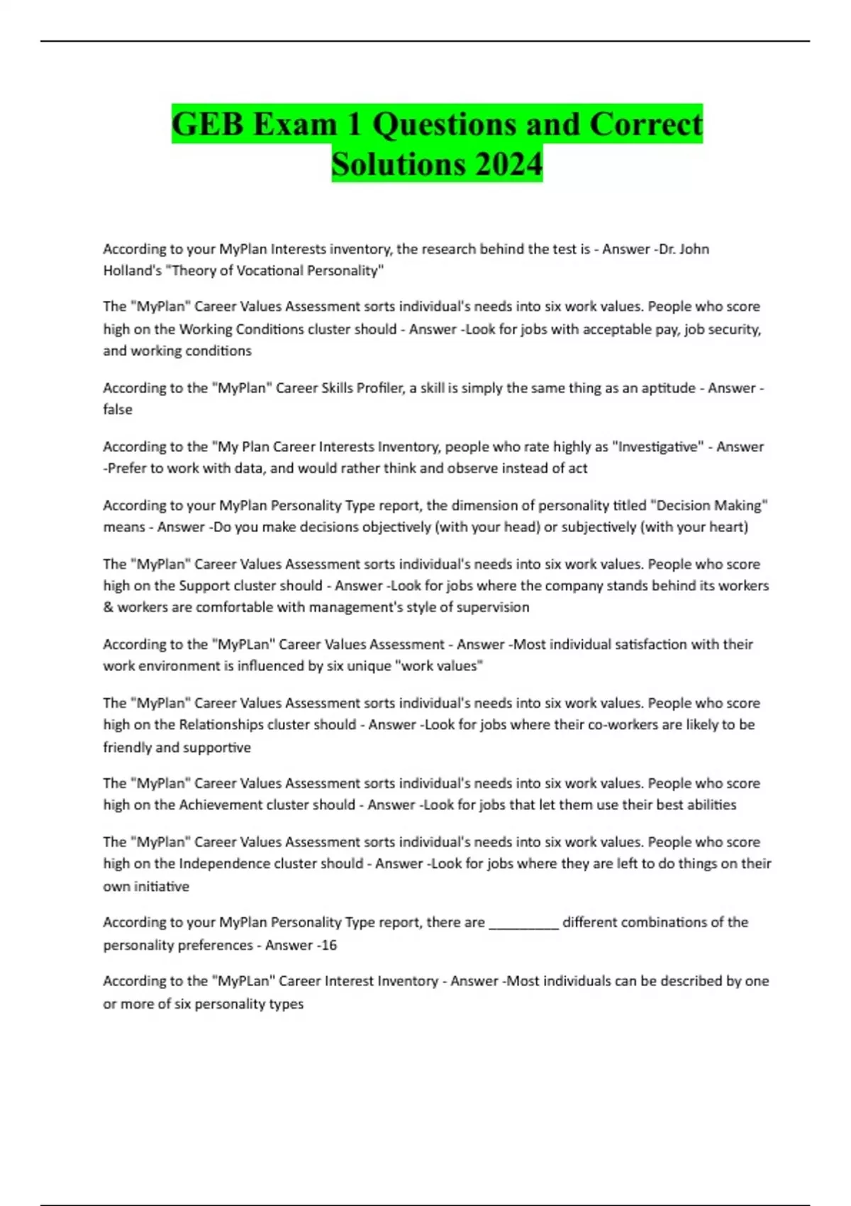 GEB Exam 1 Questions and Correct Solutions 2024 According to your MyPlan Interests inventory, the research behind the test is - Answer -Dr. John Holland's "Theory of Vocational Personality" The "MyPlan" Career Values Assessment sorts individual's needs into six work values. People who score high on the Working Conditions cluster should - Answer -Look for jobs with acceptable pay, job security, and working conditions According to the "MyPlan" Career Skills Profiler, a skill is simply the same thing as an aptitude - Answer - false According to the "My Plan Career Interests Inventory, people who rate highly as "Investigative" - Answer -Prefer to work with data, and would rather think and observe instead of act According to your MyPlan Personality Type report, the dimension of personality titled "Decision Making" means - Answer -Do you make decisions objectively (with your head) or subjectively (with your heart) The "MyPlan" Career Values Assessment sorts individual's needs into six work values. People who score high on the Support cluster should - Answer -Look for jobs where the company stands behind its workers & workers are comfortable with management's style of supervision According to the "MyPLan" Career Values Assessment - Answer -Most individual satisfaction with their work environment is influenced by six unique "work values" The "MyPlan" Career Values Assessment sorts individual's needs into six work values. People who score high on the Relationships cluster should - Answer -Look for jobs where their co-workers are likely to be friendly and supportive The "MyPlan" Career Values Assessment sorts individual's needs into six work values. People who score high on the Achievement cluster should - Answer -Look for jobs that let them use their best abilities The "MyPlan" Career Values Assessment sorts individual's needs into six work values. People who score high on the Independence cluster should - Answer -Look for jobs where they are left to do things on their own initiative According to your MyPlan Personality Type report, there are _________ different combinations of the personality preferences - Answer -16 According to the "MyPLan" Career Interest Inventory - Answer -Most individuals can be described by one or more of six personality typesAccording to your MyPlan Personality Type report, the dimension of personality titled "Emotional Focus" means - Answer -Do you direct your emotions and energy "inward" o