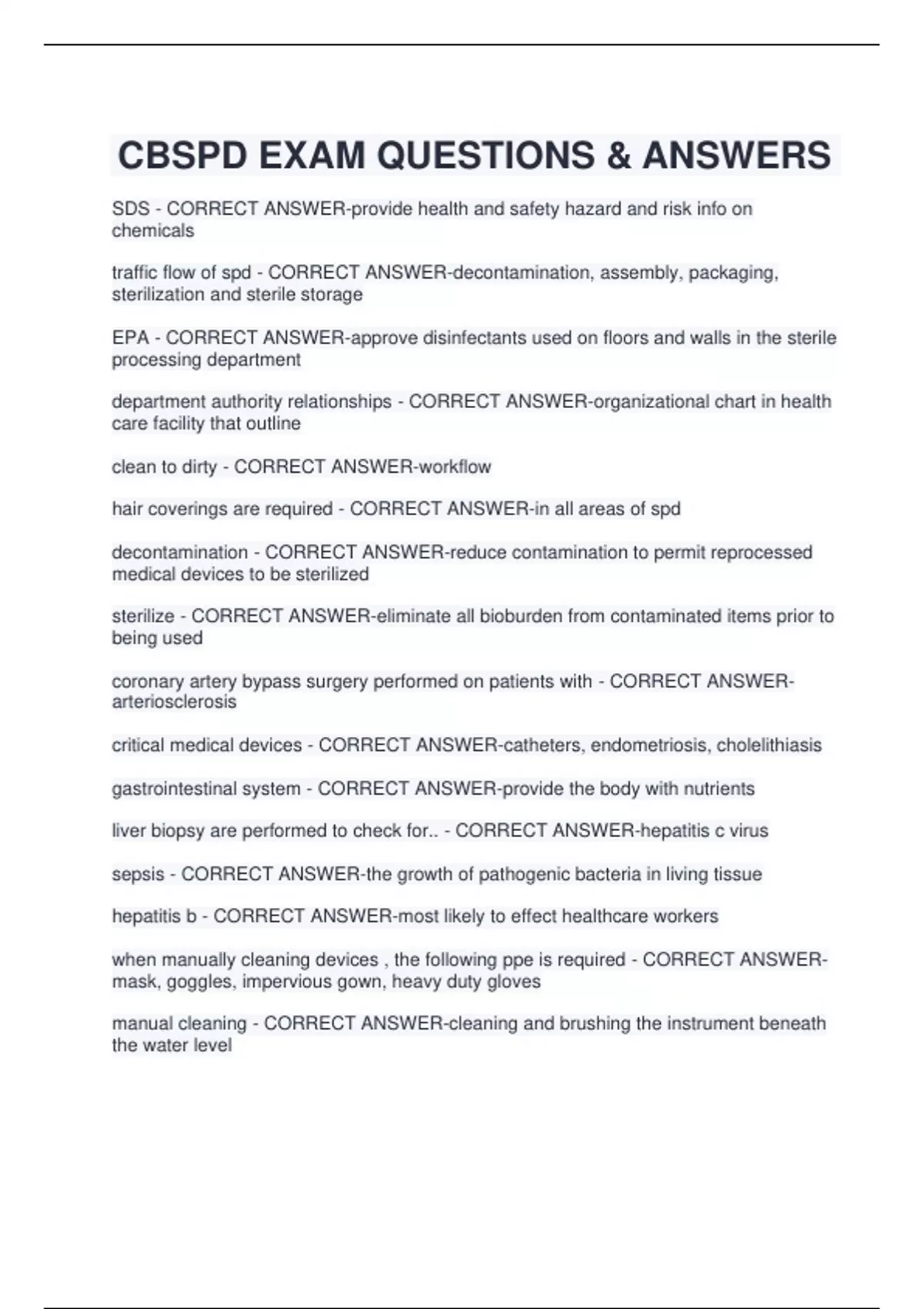 CBSPD EXAM QUESTIONS & ANSWERS SDS - CORRECT ANSWER-provide health and safety hazard and risk info on chemicals traffic flow of spd - CORRECT ANSWER-decontamination, assembly, packaging, sterilization and sterile storage EPA - CORRECT ANSWER-approve disinfectants used on floors and walls in the sterile processing department department authority relationships - CORRECT ANSWER-organizational chart in health care facility that outline clean to dirty - CORRECT ANSWER-workflow hair coverings are required - CORRECT ANSWER-in all areas of spd decontamination - CORRECT ANSWER-reduce contamination to permit reprocessed medical devices to be sterilize