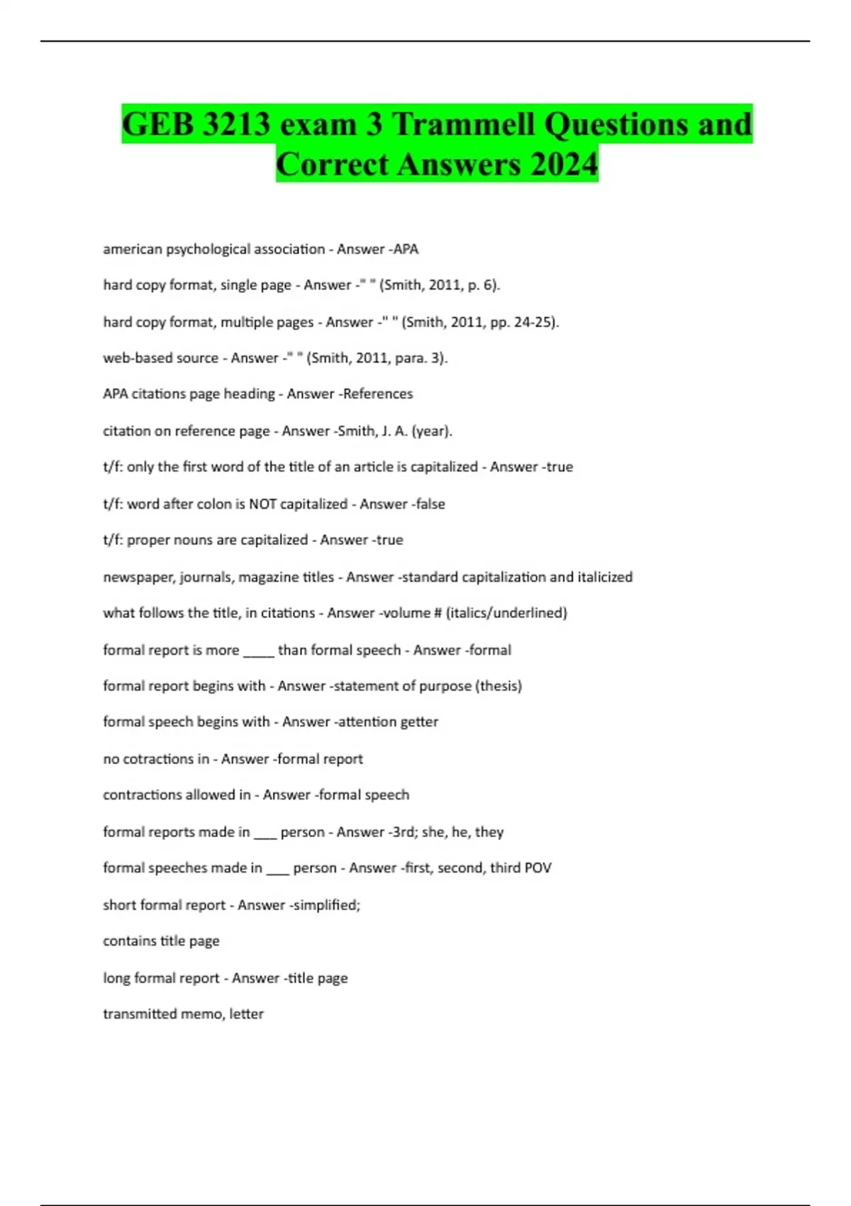 GEB 3213 exam 3 Trammell Questions and Correct Answers 2024 american psychological association - Answer -APA hard copy format, single page - Answer -" " (Smith, 2011, p. 6). hard copy format, multiple pages - Answer -" " (Smith, 2011, pp. 24-25). web-based source - Answer -" " (Smith, 2011, para. 3). APA citations page heading - Answer -References citation on reference page - Answer -Smith, J. A. (year). t/f: only the first word of the title of an article is capitalized - Answer -true t/f: word after colon is NOT capitalized - Answer -false t/f: proper nouns are capitalized - Answer -true newspaper, journals, magazine titles - Answer -standard capitalization and italicized what follows the title, in citations - Answer -volume # (italics/underlined) formal report is more ____ than formal speech - Answer -formal formal report begins with - Answer -statement of purpose (thesis) formal speech begins with - Answer -attention getter no cotractions in - Answer -formal report contractions allowed in - Answer -formal speech formal reports made in ___ person - Answer -3rd; she, he, they formal speeches made in ___ person - Answer -first, second, third POV short formal report - Answer -simplified; contains title page long formal report - Answer -title page transmitted memo, lett