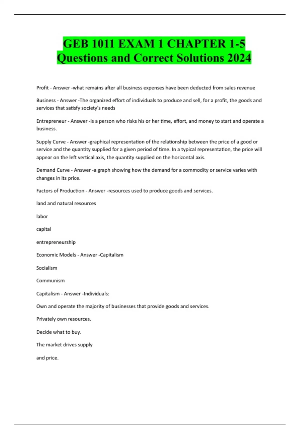 GEB 1011 EXAM 1 CHAPTER 1-5 Questions and Correct Solutions 2024 Profit - Answer -what remains after all business expenses have been deducted from sales revenue Business - Answer -The organized effort of individuals to produce and sell, for a profit, the goods and services that satisfy society's needs Entrepreneur - Answer -is a person who risks his or her time, effort, and money to start and operate a business. Supply Curve - Answer -graphical representation of the relationship between the price of a good or service and the quantity supplied for a given period of time. In a typical representation, the price will appear on the left vertical axis, the quantity supplied on the horizontal axis. Demand Curve - Answer -a graph showing how the demand for a commodity or service varies with changes in its price. Factors of Production - Answer -resources used to produce goods and services. land and natural resources labor capital entrepreneurship Economic Models - Answer -Capitalism Socialism Communism Capitalism - Answer -Individuals: Own and operate the majority of businesses that provide goods and services. Privately own resources. Decide what to buy. The market drives supply and price.