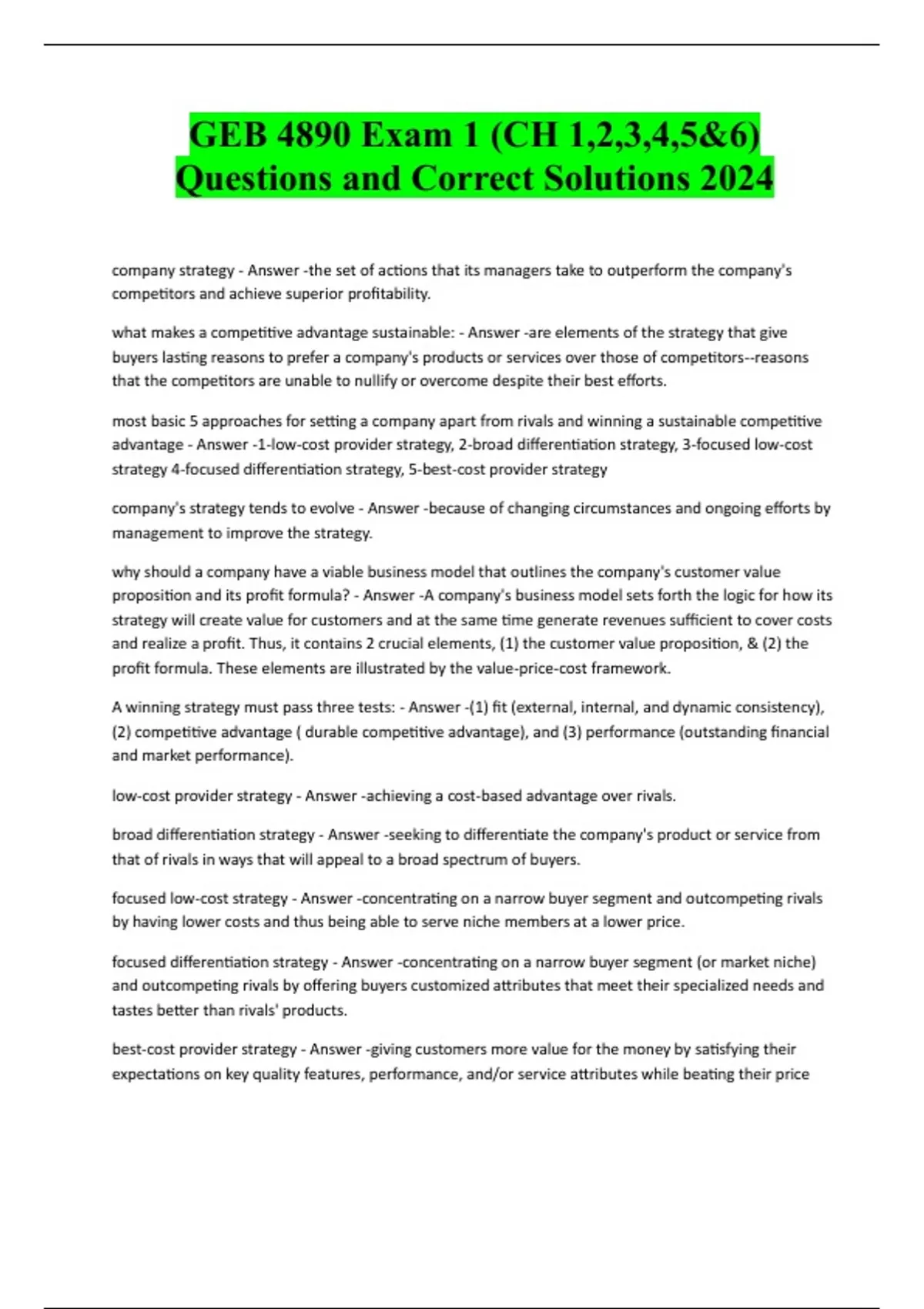 GEB 4890 Exam 1 (CH 1,2,3,4,5&6) Questions and Correct Solutions 2024 company strategy - Answer -the set of actions that its managers take to outperform the company's competitors and achieve superior profitability. what makes a competitive advantage sustainable: - Answer -are elements of the strategy that give buyers lasting reasons to prefer a company's products or services over those of competitors--reasons that the competitors are unable to nullify or overcome despite their best efforts. most basic 5 approaches for setting a company apart from rivals and winning a sustainable competitive advantage - Answer -1-low-cost provider strategy, 2-broad differentiation strategy, 3-focused low-cost strategy 4-focused differentiation strategy, 5-best-cost provider strategy company's strategy tends to evolve - Answer -because of changing circumstances and ongoing efforts by management to improve the strategy. why should a company have a viable business model that outlines the company's customer value proposition and its profit formula? - Answer -A company's business model sets forth the logic for how its strategy will create value for customers and at the same time generate revenues sufficient to cover costs and realize a profit. Thus, it contains 2 crucial elements, (1) the customer value proposition, & (2) the profit formula. These elements are illustrated by the value-price-cost framework. A winning strategy must pass three tests: - Answer -(1) fit (external, internal, and dynamic consistency), (2) competitive advantage ( durable competitive advantage), and (3) performance (outstanding financial and market performance). low-cost provider strategy - Answer -achieving a cost-based advantage over rivals. broad differentiation strategy - Answer -seeking to differentiate the company's product or service from that of rivals in ways that will appeal to a broad spectrum of buyers. focused low-cost strategy - Answer -concentrating on a narrow buyer segment and outcompeting rivals by having lower costs and thus being able to serve niche members at a lower price. focused differentiation strategy - Answer -concentrating on a narrow buyer segment (or market niche) and outcompeting rivals by offering buyers customized attributes that meet their specialized needs and tastes better than rivals' products. best-cost provider strategy - Answer -giving customers more value for the money by satisfying their expectations on key quality features, performance, and/or service attributes