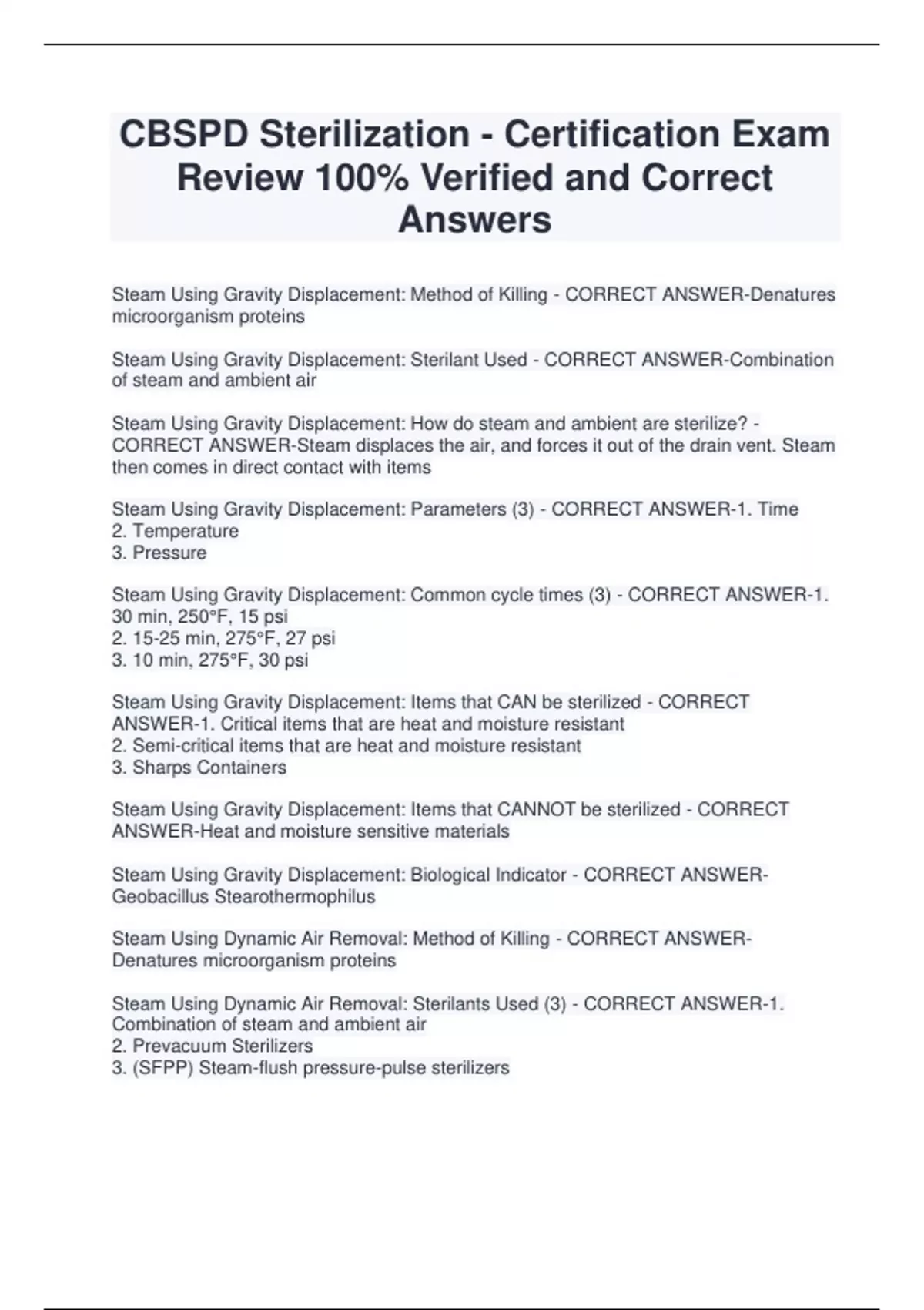 CBSPD Sterilization - Certification Exam Review 100% Verified and Correct Answers Steam Using Gravity Displacement: Method of Killing - CORRECT ANSWER-Denatures microorganism proteins Steam Using Gravity Displacement: Sterilant Used - CORRECT ANSWER-Combination of steam and ambient air Steam Using Gravity Displacement: How do steam and ambient are sterilize? - CORRECT ANSWER-Steam displaces the air, and forces it out of the drain vent. Steam then comes in direct contact with items Steam Using Gravity Displacement: Parameters (3) - CORRECT ANSWER-1. Time 2. Temperature 3. Pressure Steam Using Gravity Displacement: Common cycle times (3) - CORRECT ANSWER-1. 30 min, 250°F, 15 psi 2. 15-25 min, 275°F, 27 psi 3. 10 min, 275°F, 30 psi Steam Using Gravity Displacement: Items that CAN be sterilized - CORRECT ANSWER-1. Critical items that are heat and moisture resistant 2. Semi-critical items that are heat and moisture resistant 3. Sharps Containers Steam Using Gravity Displacement: Items that CANNOT be sterilized - CORRECT ANSWER-Heat and moisture sensitive materials Steam Using Gravity Displacement: Biological Indicator - CORRECT ANSWERGeobacillus Stearothermophilus Steam Using Dynamic Air Removal: Method of Killing - CORRECT ANSWERDenatures microorganism proteins Steam Using Dynamic Air Removal: Sterilants Used (3) - CORRECT ANSWER-1. Combination of steam and ambient air 2. Prevacuum Sterilizers 3. (SFPP) Steam-flush pressure-pulse sterilizers Steam Using Dynamic Air Removal: Parameters (3) - CORRECT ANSWER-1. Time 2. Temperature 3. Pressure Steam Using Dynamic Air Removal: Common Cycle Times (2) - CORRECT ANSWER1. 4 min, 270°F, 28-30 psi 2. 3 min, 275°F, 28-30 psi Steam Using Dynamic Air Removal: Items that CAN be sterilized - CORRECT ANSWER-1. Critical items that are heat and moisture resistant 2. Semi-critical items that are heat and moisture resistant 3. Sharps Containers Steam Using Dynamic Air Removal: It