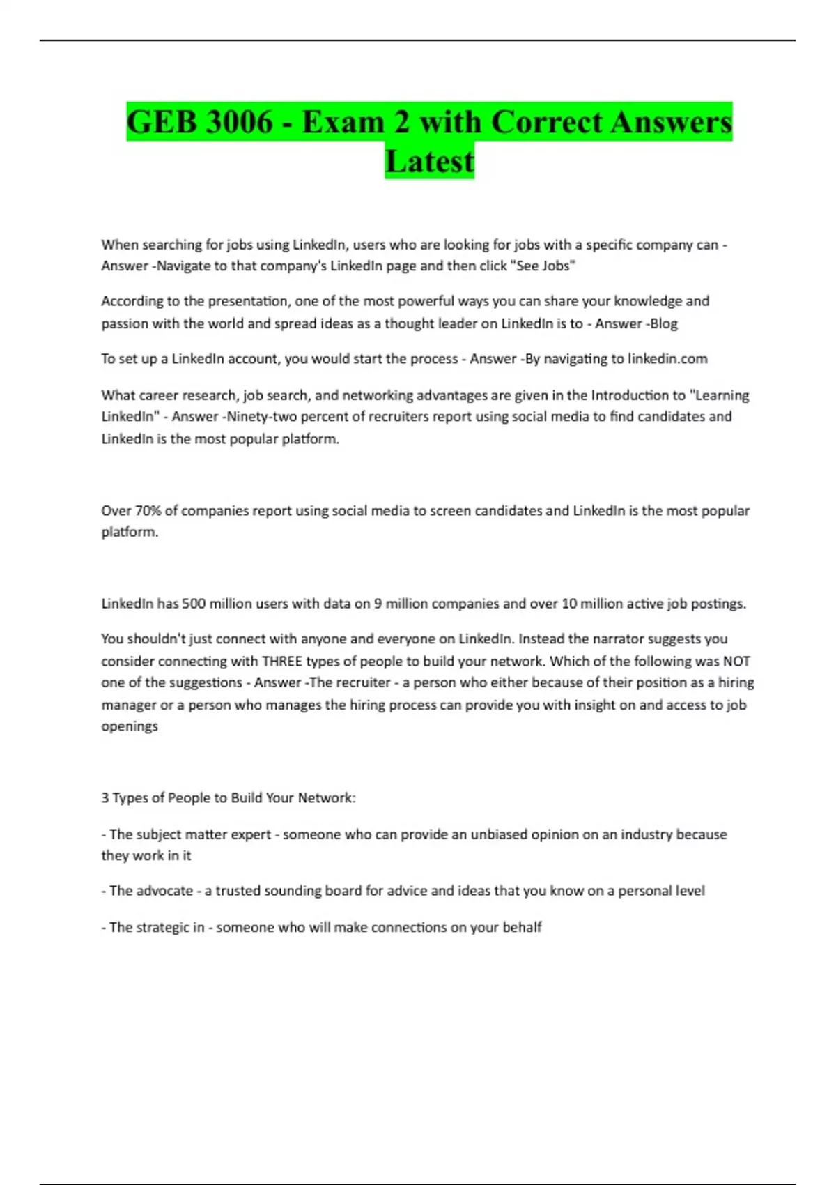 GEB 3006 - Exam 2 with Correct Answers Latest When searching for jobs using LinkedIn, users who are looking for jobs with a specific company can - Answer -Navigate to that company's LinkedIn page and then click "See Jobs" According to the presentation, one of the most powerful ways you can share your knowledge and passion with the world and spread ideas as a thought leader on LinkedIn is to - Answer -Blog To set up a LinkedIn account, you would start the process - Answer -By navigating to What career research, job search, and networking advantages are given in the Introduction to "Learning LinkedIn" - Answer -Ninety-two percent of recruiters report using social media to find candidates and LinkedIn is the most popular platform. Over 70% of companies report using social media to screen candidates and LinkedIn is the most popular platform. LinkedIn has 500 million users with data on 9 million companies and over 10 million active job postings. You shouldn't just connect with anyone and everyone on LinkedIn. Instead the narrator suggests you consider connecting with THREE types of people to build your network. Which of the following was NOT one of the suggestions - Answer -The recruiter - a person who either because of their position as a hiring manager or a person who manages the hiring process can provide you with insight on and access to job openings 3 Types of People to Build Your Network: - The subject matter expert - someone who can provide an unbiased opinion on an industry because they work in it - The advocate - a trusted sounding board for advice and ideas that you know on a personal level - The strategic in - someone who will make connections on your behalf
