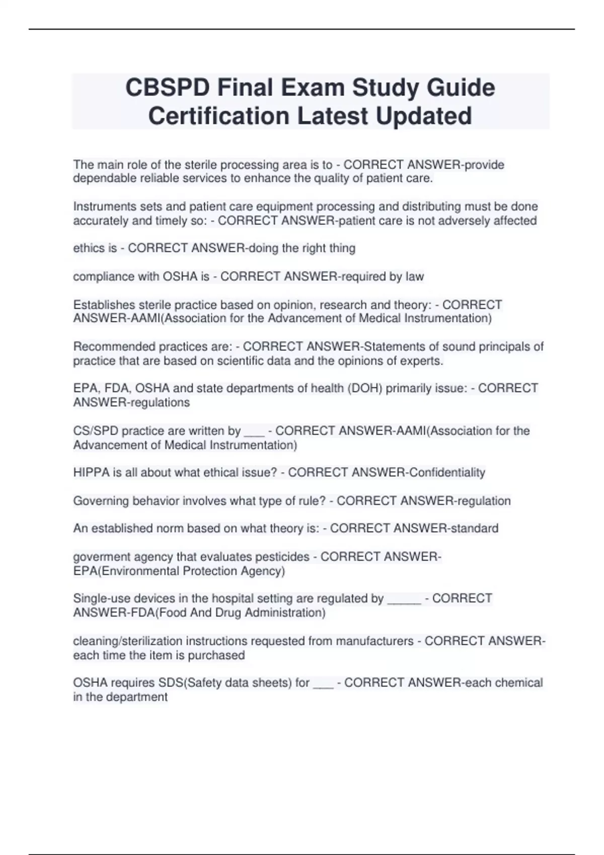 CBSPD Final Exam Study Guide Certification Latest Updated The main role of the sterile processing area is to - CORRECT ANSWER-provide dependable reliable services to enhance the quality of patient care. Instruments sets and patient care equipment processing and distributing must be done accurately and timely so: - CORRECT ANSWER-patient care is not adversely affected ethics is - CORRECT ANSWER-doing the right thing compliance with OSHA is - CORRECT ANSWER-required by law Establishes sterile practice based on opinion, research and theory: - CORRECT ANSWER-AAMI(Association for the Advancement of Medical Instrumentation) Recommended practices are: - CORRECT ANSWER-Statements of sound principals of practice that are based on scientific data and the opinions of experts. EPA, FDA, OSHA and state departments of health (DOH) primarily issue: - CORRECT ANSWER-regulations CS/SPD practice are written by ___ - CORRECT ANSWER-AAMI(Association for the Advancement of Medical Instrumentation) HIPPA is all about what ethical issue? - CORRECT ANSWER-Confidentiality Governing behavior involves what type of rule? - CORRECT ANSWER-regulation An established norm based on what theory is: - CORRECT ANSWER-standard goverment agency that evaluates pesticides - CORRECT ANSWEREPA(Environmental Protection Agency) Single-use devices in the hospital setting are regulated by _____ - CORRECT ANSWER-FDA(Food And Drug Administration) cleaning/sterilization instructions requested from manufacturers - CORRECT ANSWEReach time the item is purchased OSHA requires SDS(Safety data sheets) for ___ - CORRECT ANSWER-each chemical in the department Science branch refers to FORM and ORGANIZATION of body parts: - CORRECT ANSWER-Anatomy science branch refers to FUNCTION of specific body parts: - CORRECT ANSWERphysiology Smallest most numerous structural units processing basic life characteristics are: - CORRECT ANSWER-cells An environment factor not required for the life of cells is: - CORRECT ANSWER-cold The cell's brain is the - CORRECT ANSWER-nucleus cell portion that contains DNA - CORRECT ANSWER-nucleus complex structures with specialized functions in the body are: - CORRECT ANSWERorgans where do red blood cells develop? - CORRECT ANSWER-b