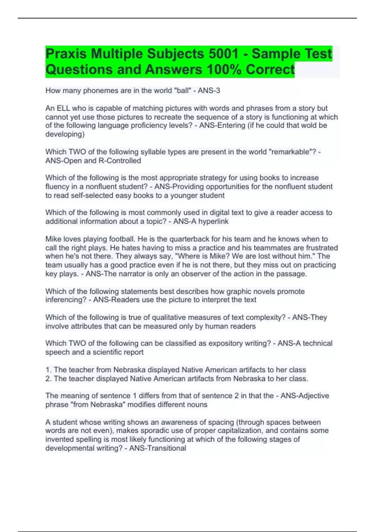 Praxis Multiple Subjects 5001 - Sample Test Questions and Answers 100% Correct