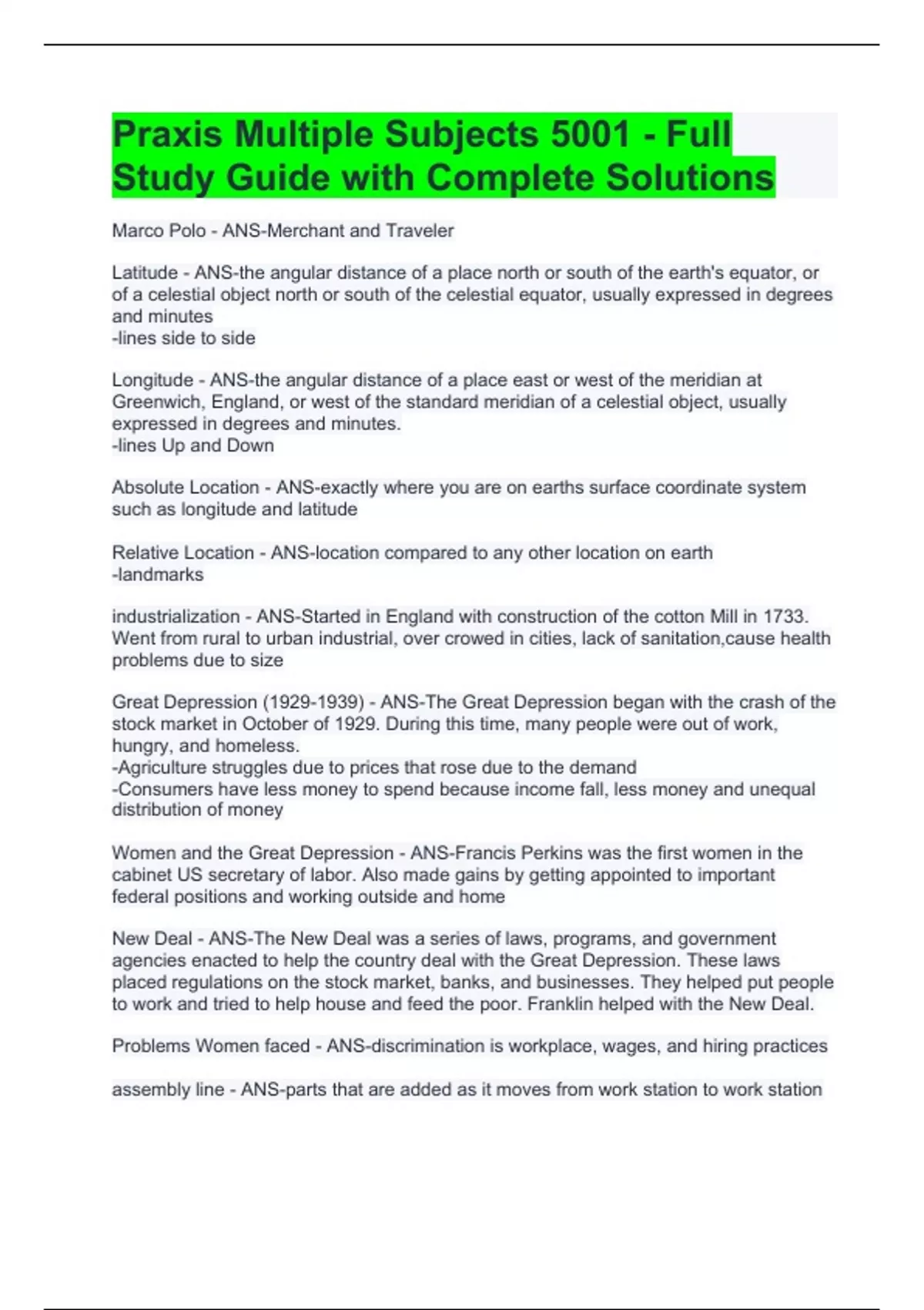 Praxis Multiple Subjects 5001 - Full Study Guide with Complete Solutions