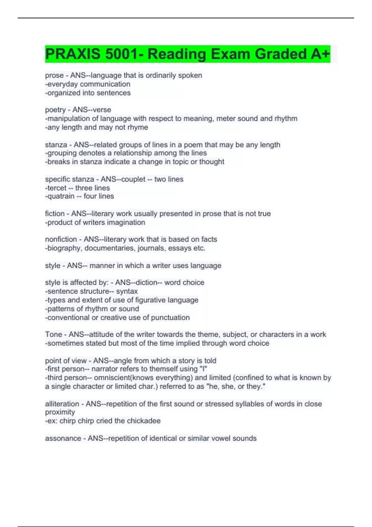 PRAXIS 5001- Reading Exam Graded A+