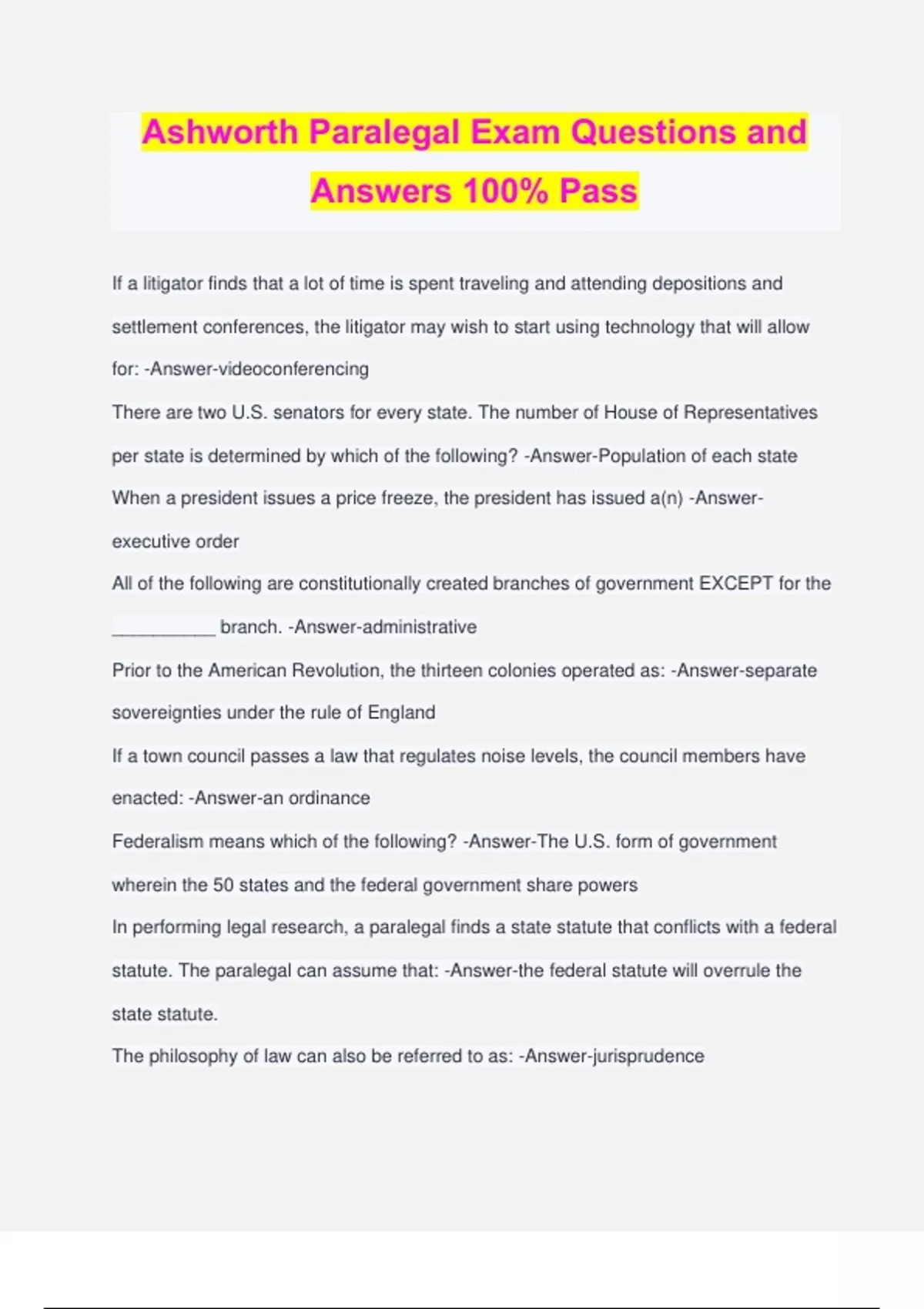 Ashworth Paralegal Exam Questions and Answers 100% Pass If a litigator finds that a lot of time is spent traveling and attending depositions and settlement conferences, the litigator may wish to start using technology that will allow for: -Answer-videoconferencing There are two U.S. senators for every state. The number of House of Representatives per state is determined by which of the following? -Answer-Population of each state When a president issues a price freeze, the president has issued a(n) -Answer- executive order All of the following are constitutionally created branches of government EXCEPT for the __________ branch. -Answer-administrative Prior to the American Revolution, the thirteen colonies operated as: -Answer-separate sovereignties under the rule of England If a town council passes a law that regulates noise levels, the council members have enacted: -Answer-an ordinance Federalism means which of the following? -Answer-The U.S. form of government wherein the 50 states and the federal government share powers In performing legal research, a paralegal finds a state statute that conflicts with a federal statute. The paralegal can assume that: -Answer-the federal statute will overrule the state statute. The philosophy of law can also be referred to as: -Answer-jurisprudence Keeping the peace, shaping moral standards, promoting social justice, and maximizing individual freedoms are: -Answer-functions of law Skype is an example of which of the following services? -Answer-Voice over Internet Protocol If an estate paralegal needs to prepare a calculation and presentation that shows all expenses of a closed estate file, that paralegal should prepare a: -Answer-spreadsheet Converting documents to electronic format can be done by: -Answer-document scanning One benefit of stare decisis is which of the following? -Answer-Litigants can somewhat anticipate the outcome of their cases based on case law The massive delivery of electronic messages and documents means that which of the following may inadvertently be produced in the course of discovery? -Answer-Privileged and confidential documents The City of Yawn has issued an ordinance requiring citizens to turn out their lights by 9 p.m. Several college students have filed suit, alleging that the law is unconstitutional. Which of the following is true? -Answer-The ordinance can be struck down by any state or federal laws that conflict with the ordinance. A very popular file format, which allows an Internet user to download forms or other paginated documents, is: -Answer-PDF. The judicial branch has the power to examine the acts of the other two branches of government and also to: -Answer-determine if their acts are constitutional. A compact made between nations can be called a(n): -Answer-treaty. Which of the following devices translates electronic signals to allow computers to communicate with one another? -Answer-Modem. The supremacy clause makes: -Answer-federal law superior to state law when there is a conflict. Courts have come to recognize the following as two categories of due process: - Answer-Substantive and procedural The body of rules that must be followed and obeyed can also be referred to as: - Answer-the law. If a personal injury attorney is seeking to create a slide show that visually details a client's future lost wages, the attorney may create slides using: -Answer-Microsoft PowerPoint. One of the earliest examples of technology at work in the courtroom is: -Answer- videotaped depositions of expert witnesses. An Affirmative Action provision is acceptable in the admissions process within public schools, provided it does NOT do which of the following? -Answer-Constitute a quota system The first Ten Amendments to the U.S. Constitution are commonly referred to as: - Answer-The Bill of Rights The computer chip and memory module that performs the basic computer functions is known as the: -Answer-CPU. If a firm administrator is concerned about who can access a firm's computers, networks, and files, the administrator may use a(n.: -Answer-firewall. A president can be impeached if he or she: -Answer-allegedly commits treason