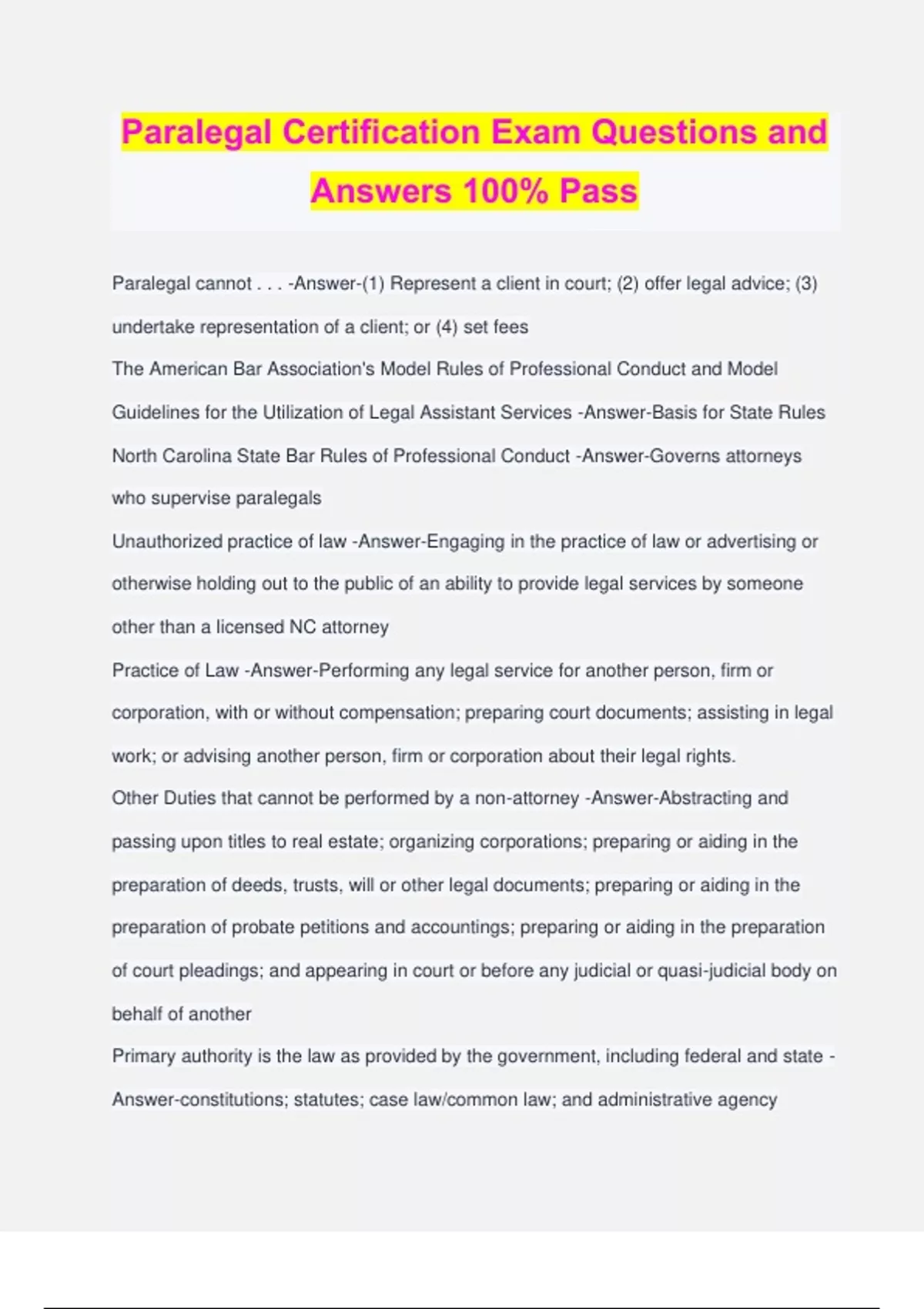 Paralegal Certification Exam Questions and Answers 100% Pass Paralegal cannot . . . -Answer-(1) Represent a client in court; (2) offer legal advice; (3) undertake representation of a client; or (4) set fees The American Bar Association's Model Rules of Professional Conduct and Model Guidelines for the Utilization of Legal Assistant Services -Answer-Basis for State Rules North Carolina State Bar Rules of Professional Conduct -Answer-Governs attorneys who supervise paralegals Unauthorized practice of law -Answer-Engaging in the practice of law or advertising or otherwise holding out to the public of an ability to provide legal services by someone other than a licensed NC attorney Practice of Law -Answer-Performing any legal service for another person, firm or corporation, with or without compensation; preparing court documents; assisting in legal work; or advising another person, firm or corporation about their legal rights. Other Duties that cannot be performed by a non-attorney -Answer-Abstracting and passing upon titles to real estate; organizing corporations; preparing or aiding in the preparation of deeds, trusts, will or other legal documents; preparing or aiding in the preparation of probate petitions and accountings; preparing or aiding in the preparation of court pleadings; and appearing in court or before any judicial or quasi-judicial body on behalf of another Primary authority is the law as provided by the government, including federal and state - Answer-constitutions; statutes; case law/common law; and administrative agency rules/regulations. Other primary authorities include: federal treaties, and Local (city or county) ordinances "Mandatory" law -Answer-Primary authority when it is directly applicable to the fact situation at hand. Court cannot deviate, i.e., federal and state statutes. "Mandatory" law -Answer-Precedent cases (doctrine of stare decisis): prior cases from a court of equal or higher rank in the same jurisdiction with same facts and same issues - court must follow those prior "precedent" cases and are mandatory authority "Persuasive authority" -Answer-Facts or issues before the court are a bit different from those in a prior decision, i.e., "distinguishable" - prior case may become simply "persuasive authority" rather than mandatory Secondary authority is not the law itself - it is something that describes, discusses , or comments on the law -Answer-legal dictionaries; encyclopedia